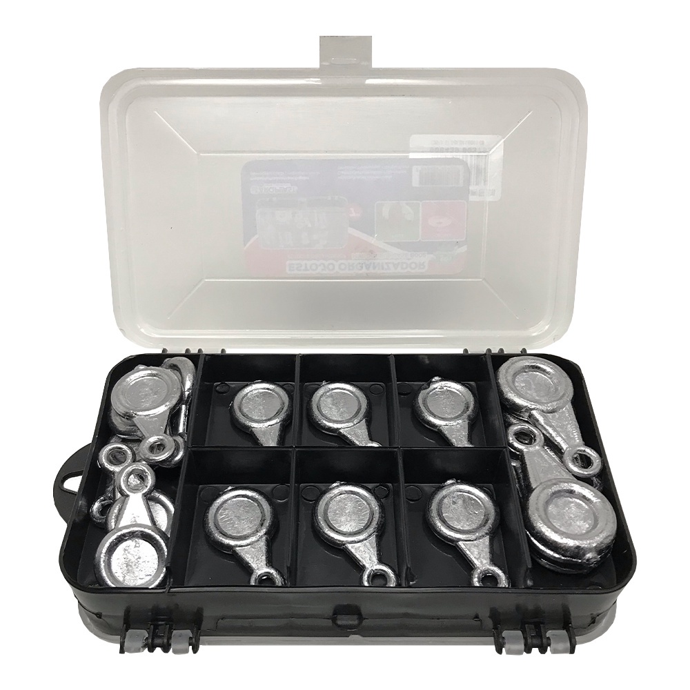 O Kit Estojo Com Chumbada Gota Para Pesca Na Praia Costão Mar foi desenvolvido para pescaria na praia, com as chumbadas certas para essa pescaria, e acompanha um estojo organizador com 13 divisórias, para guardar e transportar as 32 chumbadas que acompanha este kit e tudo isso com um preço muito acessível, o estojo é feito em polipropileno de alta qualidade, resistência e durabilidade. Sem duvida este é o kit especial para a sua pescaria! Descrição do kit: Acompanha um estojo organizador duplo 17,5x10,5x4,5cm Chumbadas, utilizado em pesca de fundo, para manter a isca no fundo da água 12pçs Chumbada gota 20g 8pçs Chumbada gota 40g 8pçs Chumbada gota 50g 4pçs Chumbada gota 70g Imagens Ilustrativas
