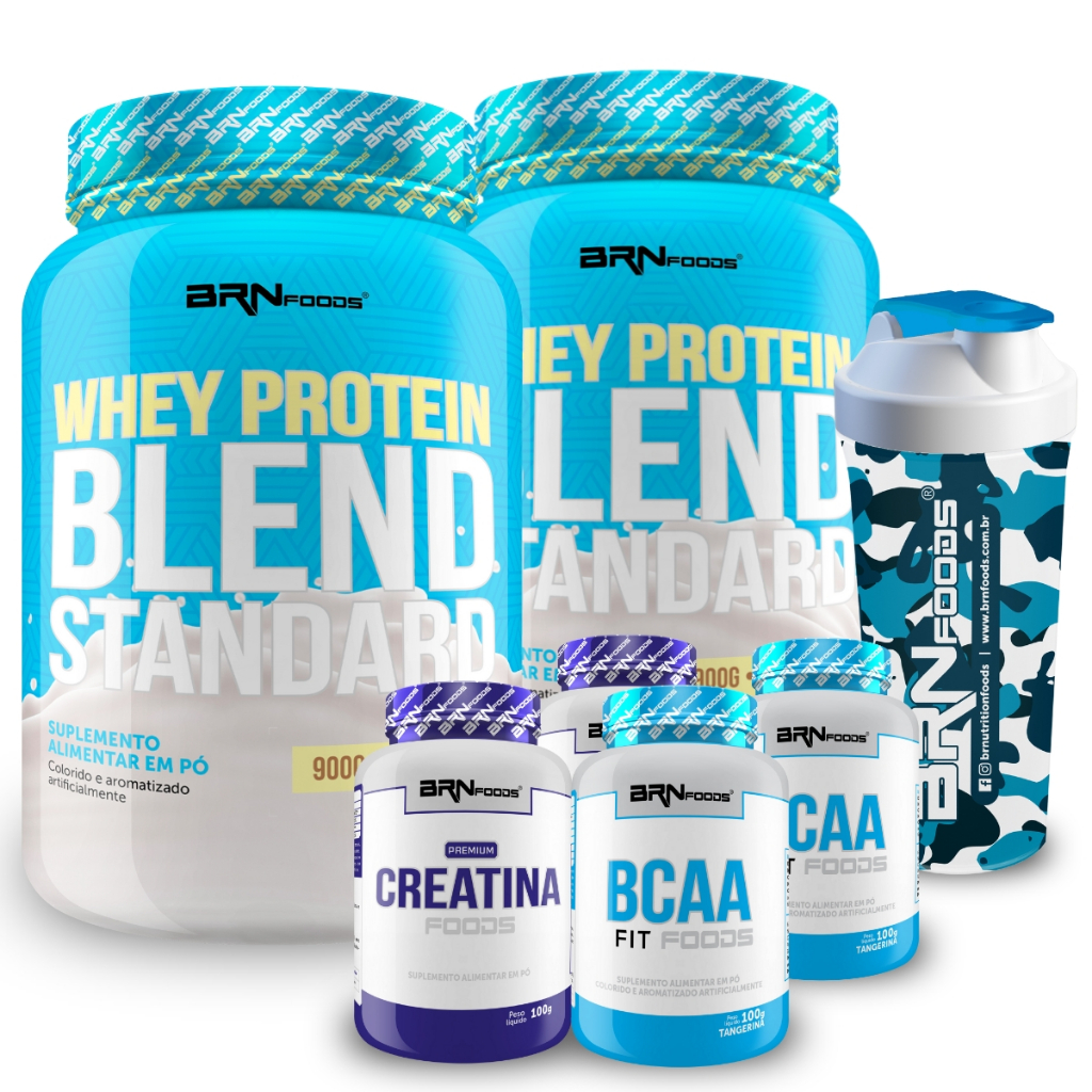 ➡️BLEND STANDARD: ➡️Sugestão de uso: ⚡Adicionar 50g (5 colheres de sopa rasas) em 350ml de água. bater no liquidificador ou coqueteleira por 20 segundos e consumir imediatamente após o preparo. ➡️Ingredientes: ⚡Proteína concentrada do soro do leite, proteína isolada da soja, maltodextrina, amigo de milho ceroso, soro do leite, sacarose, espessante goma xantana, aromatizantes, edulcorantes e sucralose. NÃO CONTÉM GLÚTEN. ➡️PREMIUM CREATINA: ➡️Sugestão de uso: ⚡Adicionar 10g (2 colheres de chá rasas) em 100ml de água. Consumir imediatamente após o preparo. ➡️Ingredientes: ⚡Creatina monohidratada em pó, amilopectina, maltodextrina, antiumectante, corante amarelo crepúsculo e aroma. NÃO CONTÉM GLÚTEN. ➡️BCAA FIT FOODS: ➡️Sugestão de uso: ⚡Misturar 4g (1 colher de chá) em 200ml de água. Consumir imediatamente após o preparo ➡️Ingredientes: ⚡Dextrose, L-Leucina, L-Valina, L-Isoleucina, acidulante ácido cítrico, edulcorante sucralose, corante amarelo crepúsculo e aromatizante sintético idêntico ao natural de tangerina. NÃO CONTÉM GLÚTEM. ➡️COQUETELEIRA BRN FOODS 600ML (⚡Cor/estampa podem variar de acordo com a disponibilidade de estoque!⚡) -------------------------------------------------------------------------------------------------------------------------------------------------------------------------------------------------------- ➡️NOTA: ⚡Antes de iniciar o uso de qualquer suplemento, é aconselhável consultar um profissional de saúde ou nutricionista para determinar se ele é apropriado para suas necessidades e objetivos individuais. Além disso, é fundamental seguir as instruções de dosagem e não exceder as recomendações do fabricante.⚡