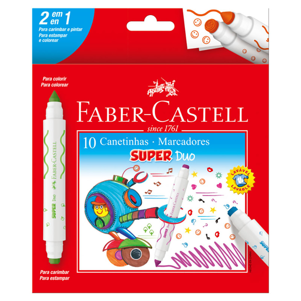 INMETRO 008053/2017 As canetinhas hidrográficas Super Duo estimulam a criatividade das crianças com a formulação exclusiva de corantes de alta qualidade com cores mais vivas. As canetinhas possuem dois lados: um para desenhar e colorir e outro para carimbar e se divertir! A tinta é lavável e o produto é atóxico. Detalhes: - Lavável. - Muito mais diversão - Um lado para desenhar e colorir, o outro para carimbar e se divertir.