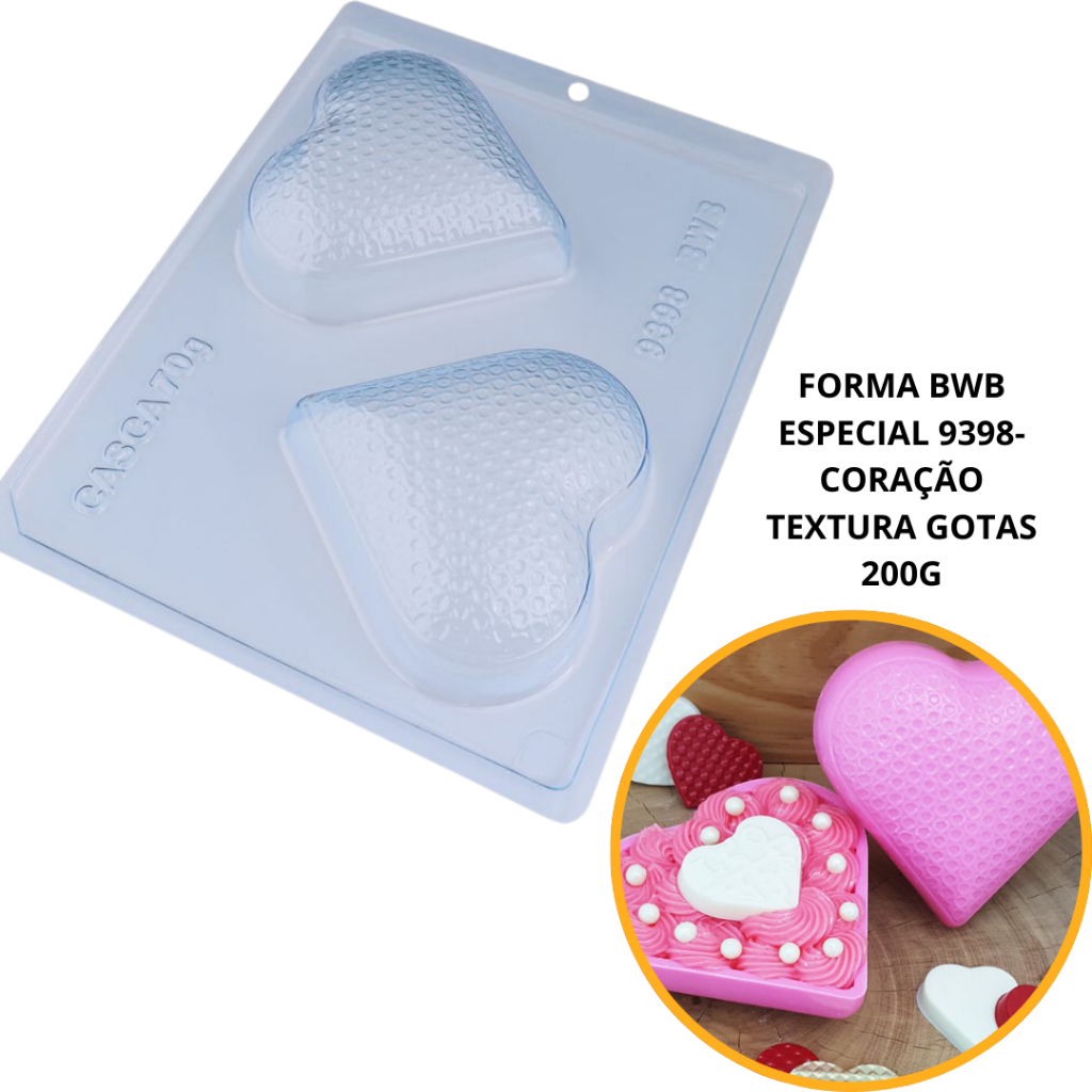 Forma especial com silicone (3 partes), ideal para produção de chocolates com muito mais praticidade e precisão. 1 parte de moldar 1 silicone para desinformar 1 parte de baixo para pressionar cod 9397 Coração Textura Gouge 200 g Descrição do Produto Cavidades: 2 Dimensões (mm): Comp.: 105 x Larg.: 103 x Alt.: 31 Peso Casquinha: 70g Peso Médio: 200g MAIS RESISTENTE REUTILIZÁVEL PRATICO RÁPIDO MUITO MAIS FÁCIL DE FAZER MAIS TRANSPARÊNCIA INCOLOR MARCA ATÉ ONDE coloca o chocolate Qualquer dúvida, faça uma pergunta ao vendedor!