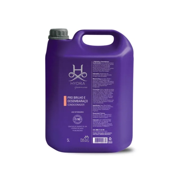 Descrição: Condicionador e Desembaraçador de Pelos para Cães e Gatos, é um produto testado e aprovado da mais nova linha Hydra Grommers da consagrada Pet Society. Possui em sua formulação ativos emolientes que fornecem maior maciez, brilho e maleabilidade, tornando sua aparência muito mais saudável e bonita. Formula concentrada que permite diluição em até 10 partes de água para cada parte de produto. Embalagem: 5 Litros Indicação: Brilho e Desembaraço PRO para uso profissional indicada para cães e gatos de todas as raças. Modo de Usar: - Uso tópico: 1º Banhar o animal com o Hydra Shampoo. 2º Diluir o Condicionador Brilho e Desembaraço em até 10 partes de água. 3º Espalhar o condicionador por toda a pelagem, massageando bem. 4º Enxague até remover todo o resíduo. Pet Society: A Pet Society, fundada em 20 de outubro de 2004, é uma das mais reconhecidas marcas de higiene pet, embelezamento e saúde animal do mercado brasileiro. Mais de 25 anos de experiência na área de ingredientes cosméticos e formulações voltadas ao restrito mercado veterinário. O grupo da Pet Society visa desenvolver, criar e inovar em toda sua linha de produtos com extrema qualidade com base em todos os anos de pesquisas e mantendo sempre a responsabilidade com o meio-ambiente.