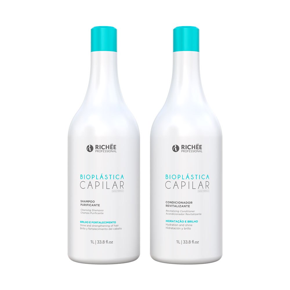 1 Shampoo Purificante 1L1 Condicionador Revitalizante 1L Uma linha versátil para o cuidado diário dos fios. Contém Extrato de Aloe Vera, Ceramidas e Proteína Hidrolisada da Seda, que oferecem alto poder de hidratação e emoliência, proporcionando brilho e suavidade aos cabelos opacos e sem vida. Além de Queratina e Proteína Hidrolisada de Trigo para o fortalecimento dos fios, evitando a quebr Indicação: Todos os tipos de cabelos Ingredientes e Benefícios •D-Pantenol: força e maciez•Colágeno: forma filme protetor e resistência•Queratina hidrolisada: restaura e condiciona•Manteiga de Karité: hidratação e redução do frizz•Óleo de girassol: redução de pontas duplas e antioxidante•Óleo de coco: umectação e brilho•Extrato de Aloe Vera: hidratação e cicatrizante•Proteína Hidrolisada da Seda: elasticidade e emoliência•Proteína Hidrolisada de Trigo: flexibilidade e condicionamento Modo de Usar 1. Com os cabelos molhados, aplique o Shampoo Purificante, massageando suavemente o couro cabeludo em suaves movimentos, permitindo que a espuma se espalhe pela extensão dos fios. Enxágue e repita este processo, se necessário;2. Aplique o Condicionador Revitalizante de maneira uniforme, do comprimento às pontas, e massageie suavemente. Deixe agir por 1 minuto, para que os ingredientes condicionantes possam agir com mais eficácia, e em seguida enxágue bem. Resultado: Limpeza, brilho e fortalecimento dos fios. Sobre a linha Bioplástica Uma linha rica em ativos e versátil para o cuidado diário dos fios e uso no dia a dia do salão de beleza. Ideal para todos os tipos de cabelos, que necessitam de maciez, brilho e fortalecimento da fibra capilar. Sobre a Richée Ser Richée é estar sempre um passo à frente. Por isso, a prevenção tem sido o forte na elaboração de produtos com qualidade profissional e acessíveis a todos os consumidores. A tecnologia e o conhecimento sobre a ação dos mais diversos ingredientes ativos da biodiversidade brasileira e mundial estão entre os aspectos importantes da marca. E a criatividade na elaboração de cosméticos que atendam a todas as exigências é um importante diferencial que permitiu à Richée estar hoje entre as marcas nacionais mais relevantes. O compromisso da Richée com a beleza real, se expressa na vontade de que os produtos tragam benefícios além da beleza externa e na identidade cultural e étnica, de modo que a beleza seja expressa de modo individual e único por cada um de nossos consumidores. Esse mesmo compromisso está presente nos mais de 30 países em que a Richée atua, reforçando ainda mais as qualidades plurais de nossos produtos. Autenticidade e sofisticação são os ingredientes fundamentais para nosso sucesso.