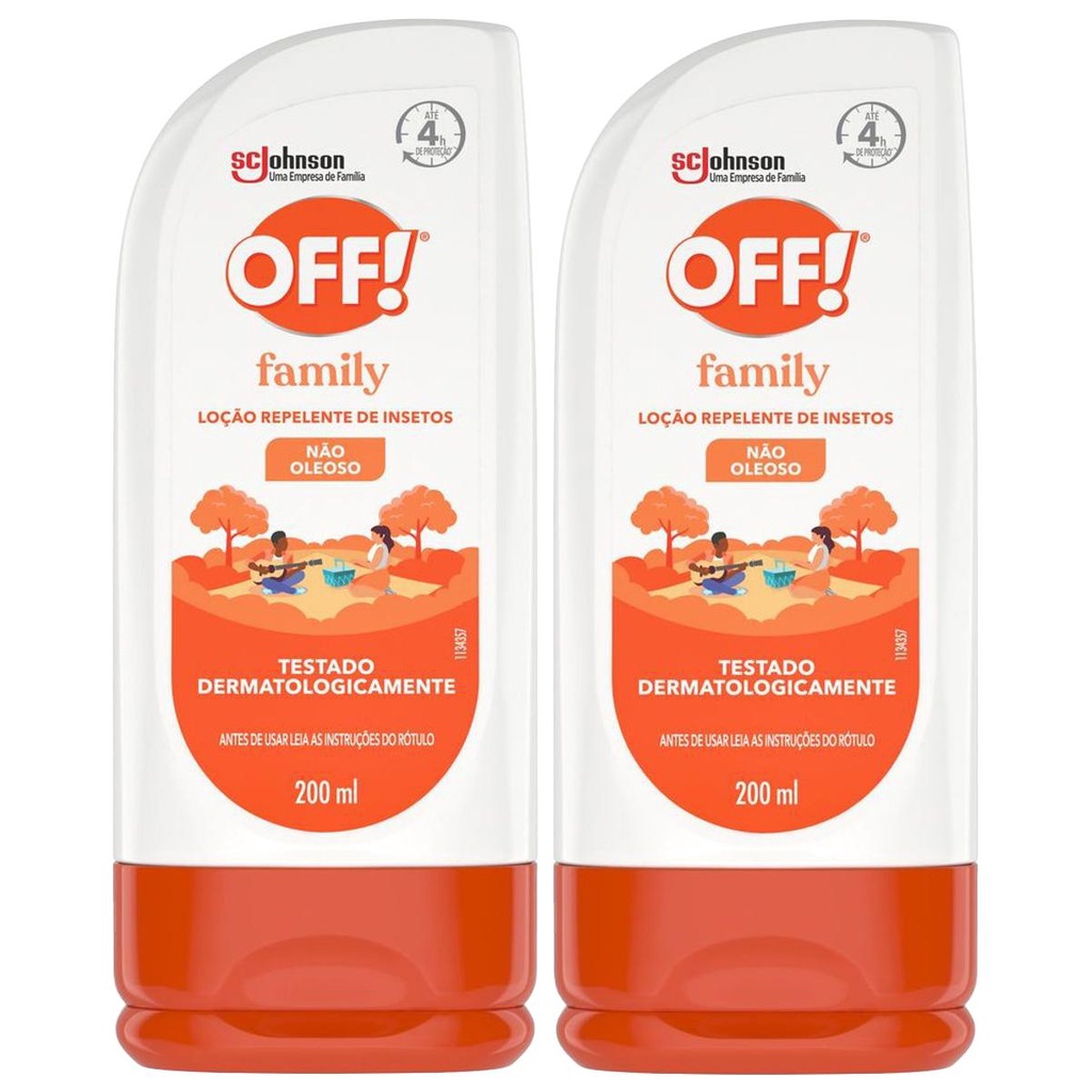 Kit 2 Repelente de Insetos Off! Loção Family 200ml Loção OFF Family desenvolvido para ser usado por toda a família e pode ser usado em crianças a partir de 2 anos. Para que serve: Sua fórmula não oleosa, possui Aloe Vera e protege por 2 horas, inclusive do mosquito que pode transmitir o zika vírus, a dengue e a febre chikungunya. * Kit Contém: 2 Repelentes de Insetos Off! Loção Family 200ml cada * Compre Produtos Off!