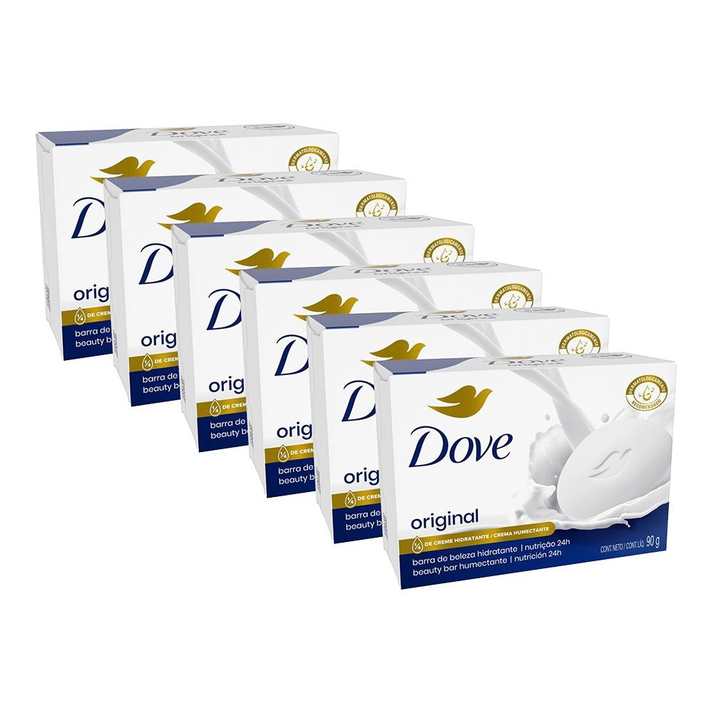 O kit contém: 6 Sabonetes em Barra Dove Original com 90g cada. - Com 1/4 de creme hidratante e agentes de limpeza suaves, Dove ajuda a proteger a hidratação natural da pele. - Dove não resseca a pele como sabonetes comuns. - Tecnologia de limpeza e manutenção da hidratação com suavidade para sua pele. - Deixa a pele macia, bem cuidada e com aspecto saudável. - Pode ser usado diariamente no rosto, mãos e corpo. - Não é um sabonete comum, é um sabonete que ajuda na hidratação da pele. Dove não é um simples sabonete em barra comum. É um sabonete de beleza feito com tecnologia Syndet que vai além da limpeza, nutrindo a pele conforme remove a sujeira do dia a dia. O segredo para uma pele bonita é a hidratação diária, e nenhum sabonete comum hidrata melhor do que Dove. O Sabonete Dove Original combina uma fórmula de limpeza suave com 1/4 de creme hidratante, deixando a sua pele macia, bem cuidada e com a aparência saudável. O Sabonete Dove Original não retira a hidratação natural da sua pele como os sabonetes em barra comuns: sua composição com 1/4 de creme hidratante ajuda a repor os nutrientes da pele deixando-a mais bem nutrida e hidratada. Para uma melhor experiência no banho, sugerimos o seguinte modo de uso: primeiro, molhe as mãos e passe o Sabonete Dove Original entre elas até formar uma espuma. Em seguida, massageie a espuma pelo seu corpo e, por último, enxágue com água morna. O Sabonete Dove Original não vai deixar a sua pele seca e áspera como os sabonetes comuns fazem, e você pode usá-lo diariamente no rosto, mãos e no corpo. O Sabonete Dove Original é dermatologicamente recomendado.