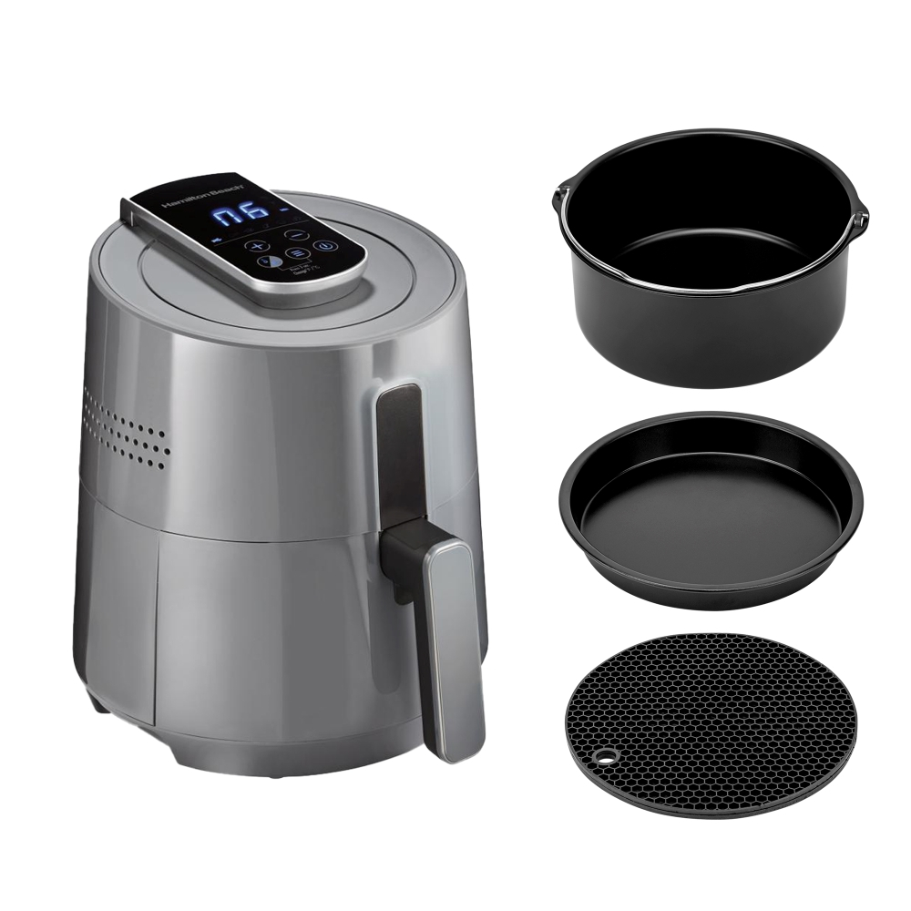 🧡 Motivos que Fazem valer a Pena 06 receitas pré-programáveis: batata frita, frango, frutos do mar, carnes, assados, legumes e verduras Painel para selecionar tempo e temperatura ideal para sua receita Painel touch 🔸 Destaques do produto Temperatura de até 200°C Potência de 1400W Funções pré-programáveis Grades removíveis e antiaderentes Capacidade 3,5 Litros Kit formas 3 em 1: Forma alta, baixa e tapete silicone 🔸 Sobre o Produto Juntando qualidade e praticidade em um único produto, temos a Fritadeira Elétrica Air Fryer 3,5L Hamilton Beach. Tornando ainda mais saudável e rápido aquele lanchinho ou até mesmo jantares. A Fritadeira Elétrica Air Fryer Hamilton Beach possui 1400W de potência para deixar ainda mais saborosa as 06 receitas pré-programáveis como batata frita, frango, frutos do mar, carnes, assados, legumes e verduras, tudo isso ao alcance da ponta dos dedos. Manter uma alimentação saudável sem perder o sabor e crocância se tornou um sonho possível! O Kit Para Fritadeira 3 em 1 Biscuitt Perfect Fryer é o companheiro ideal para qualquer fritadeira. Chega de ficar procurando formas para fazer aquele bolo delicioso, ou criar gambiarras que arrisquem o preparo e danifiquem sua Air Fryer. O Kit 3 em 1 da Biscuitt vem com forma alta, forma rasa e um exclusivo tapete de silicone. Ah, o revestimento é todo antiaderente, então, pode usar e abusar que não vai grudar. Que tal assar bolos, pães, pudins e outras delícias na forma funda com diâmetro de 16 centímetros e 7,5cm de altura? Não vai desandar e nem derramar, pode apostar. 🔸 Dimensões e Peso Aproximados Air Fryer Altura: 36,5 cm Largura: 31,5 cm Profundidade: 31,5 cm Peso: 5 kg Kit Formas Forma Alta Altura: 7,5cm Largura: ø16cm Profundidade: ø16cm Forma Rasa Altura: 2,5cm Largura: ø16cm Profundidade: ø16cm Tapete de Silicone: Altura: 1cm Largura: ø16cm Profundidade: ø16cm 🔸 Conteúdo da Embalagem 01 Fritadeira Elétrica Air Fryer 3.5L Hamilton Beach 35051 01 Forma Funda 01 Forma Rasa 01 Tapete Silicone 01 Manual de Instruções 🔸 Garantia 36 meses