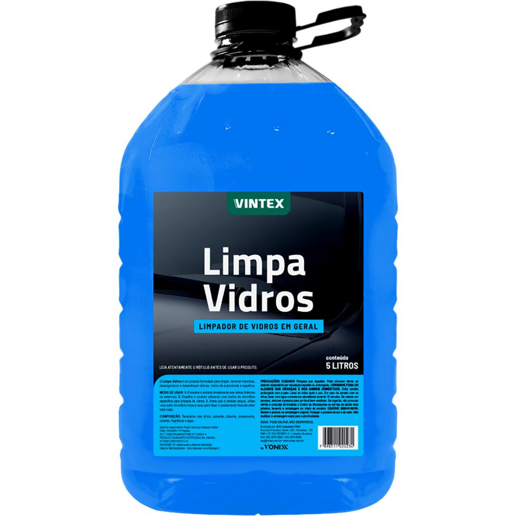 LIMPA VIDROS 5L VINTEX DESCRIÇÃO: O Limpa Vidros é um produto formulado para limpar, remover manchas, desengordurar e desembaçar vitrines, vidros de automóveis e espelhos. - LIMPA - DESENGORDURA - DESEMBAÇA MODO DE USO: 1. Pulverize o produto diretamente nos vidros (internos ou externos) 2. Espalhe o produto utilizando uma toalha de microfibra específica para limpeza de vidros 3. Antes que o produto seque, utilize uma outra microfibra limpa e seca para fazer o acabamento final até obter total visão