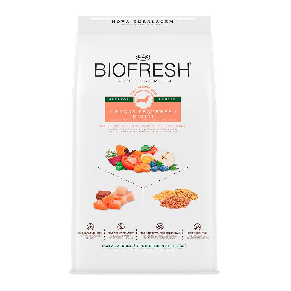 Ração Biofresh Cães Adultos Raças Pequenas e Mini 15Kg - Indicado para cães; - Para cães adultos de raças pequenas e mini; - Saúde intestinal equilibrada; - Pelagem brilhosa e pele sadia; - Saúde oral prolongada; - Palatabilidade reforçada; - Sabor mix de carnes, frutas e legumes. Biofresh Super Premium Cães é desenvolvida com ingredientes frescos de verdade, sem a adição de transgênicos, aromatizantes, corantes e conservantes artificiais, a linha proporciona uma nutrição completa, equilibrada e mais saudável para os pets. Completa e única no mercado, Biofresh possui alta inclusão de carnes, frutas, legumes e grãos nobres integrais de verdade, como arroz, aveia e linhaça, além de ervas frescas antioxidantes e conservantes naturais que ainda oferecem um sabor especial. Alimentos seguros, naturalmente saborosos, nutritivos e desenvolvidos com formulações especiais para filhotes, adultos (com as versões para pets cadastrados e também os acima do peso ideal) e seniores. Devido à tecnologia Biofresh, os alimentos têm sua preservação 100% segura e natural, garantida por meio dos antioxidantes naturais e atmosfera modificada, além de adição de fibras e minerais de alta qualidade. Biofresh Super Premium é inovador e diferente porque possui alta inclusão de ingredientes realmente frescos, diretamente da natureza. O resultado é um alimento completo e equilibrado que se destaca por elevar a nutrição dos cães de raças pequenas e mini ao seu mais alto patamar. A tecnologia Biofresh garante a preservação deste alimento de forma segura e 100% natural, sem adição de conservantes artificiais. Recomendação de uso As quantidades aqui apresentadas são orientativas, podendo variar de acordo com raça, sexo e estilo de vida, entre outros fatores. Sirva o alimento seco, em recipiente limpo, dividido em uma ou duas refeições diárias e mantenha sempre água limpa e fresca ao alcance de seu cão. Caso seu cão ainda não esteja comendo Biofresh recomenda-se que a substituição seja feita de forma gradual durante 4 a 5 dias. Leve seu cão regularmente ao veterinário. Cada xícara de chá (200ml) equivale a 90g de Biofresh. Peso do cão (kg) Baixa atividade (g/dia) Atividade moderada (<1h/d) g/dia Atividade alta (>1h/d) g/dia 1 -2Kg 25-40g 30-50g 35-55g 3-4Kg 50-65g 60-80g 75-90g 5-6Kg 80-90g 95-105g 110-125g 7-8Kg 100-110g 120-130g 140-155g 9-10Kg 120-130g 145-155g 170-185g Ingredientes Seleção de carnes frescas (carne de frango, fígado de frango e peixe) (mín. 15%), seleção de frutas, verduras e ervas frescas (maçãs, mamão, cenouras, beterrabas, orégano - fontes naturais de beta caroteno, vitaminas, minerais e fibras) (mín. 5%), blueberry (mirtilo) em pó, polpa de tomate concentrada (fonte natural de luteína), ovos desidratados, farinha de proteína isolada de suínos, óleo de peixe refinado (fonte natural de EPA e DHA), sementes de linhaça, farinha de vísceras de frango e óleo de frango (preservados naturalmente com tocoferóis e extrato de alecrim), aveia integral, arroz integral, quirera de arroz, hidrolisado de frango, cloreto de sódio (sal comum), polpa de beterraba, prebióticos (parede celular de levedura (MOS)), extrato de yucca (mín. 0,02%), zeolita, hexametafosfato de sódio, taurina, DL-metionina, L-lisina, cloreto de potássio, cloreto de colina, vitaminas (A, B1, B2, B6, B12, C, D3, E, K3, ácido fólico, ácido pantotênico, biotina e niacina), minerais orgânicos (cobre aminoácido-quelato, ferro aminoácido-quelato, manganês aminoácido-quelato, zinco aminoácido-quelato, selênio aminoácido-quelato), iodato de cálcio e antioxidantes naturais (blend de tocoferóis, extrato de alecrim, extrato de chá verde e ácido cítrico).