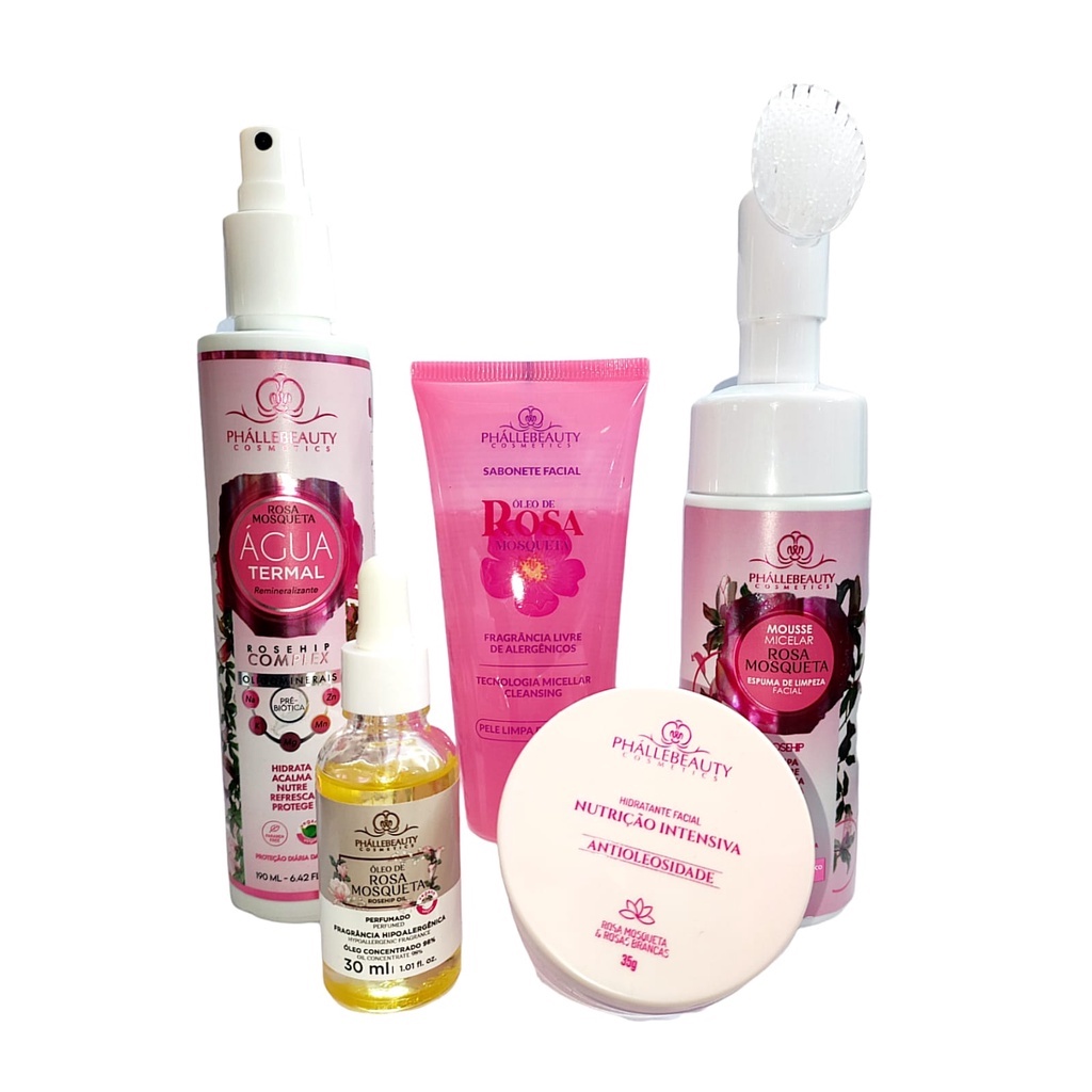 Incluso no Kit: 1x Sabonete Facial Óleo de Rosa Mosqueta 100ml PhálleBeauty 1x Mousse Micelar Espuma de Limpeza Rosa Mosqueta 150ml PhálleBeauty 1x Água Termal Remineralizante Rosa Mosqueta 190ml PhálleBeauty 1x Óleo de Rosa Mosqueta 30ml PhálleBeauty 1x Hidratante Facial Gel Creme Nutrição Intensiva 35g PhálleBeauty ------------------------------------------------------------------------------------------------------------------------------------------------------------------------------- -- Mousse Micelar Rosa mosqueta: Sua pele merece esse cuidado! Um inédito e diferente jeito de limpar e tratar o rosto. O Mousse Micelar Rosa Mosqueta é uma espuma cremosa rica em vitamina E e ácido hialurônico que limpam minuciosamente a pele eliminando a oleosidade, a poluição e resíduos de maquiagens, filtros solares e outros produtos comedogênicos. Garantindo total purificação, restaurando assim a naturalidade e a saúde da pele. -- Sabonete Facial Óleo de Rosa Mosqueta: É ideal para uso diário por deixar a pele limpa e macia Formulado com Óleo de Rosa Mosqueta, que é extraído das sementes do fruto da Rosa Mosqueta, ele atua na limpeza facial sem comprometer a hidratação da pele Sua textura adapta o uso para proporcionar maciez, suavidade e hidratação, reparando a pele e intensificando a sensação de cuidado por mais tempo O cuidado que a sua pele precisava Ideal para pele seca -- Água Termal Rosa Mosqueta Phállebeauty: é rica em minerais, como Sódio, Magnésio, Zinco e Manganês que estimulam a renovação da estrutura das células e a formação de colágeno. Sua formulação possui características específicas que acionam o despertar da pele. Após a aplicação ocorre a ativação dos seus benefícios: Hidratação, umectação e revitalização, deixando a pele mais saudável e protegida de agressores externos. -- O Óleo de Rosa Mosqueta: é extremamente cheiroso, auxilia na maciez da pele, mantendo saudável e cheirosa. Sua concentração de 98% ajuda na hidratação, anti envelhecimento, combate a acne e ajuda contra as estrias. Sua fragrância é hipoalergênica. -- Hidratante Facial Gel Creme Nutrição Intensiva: Para uma pele mais hidratada, uniforme e viçosa. Seus componentes auxiliam no tratamento e prevenção dos processos de envelhecimento cutâneo, promovendo firmeza e hidratação da pele.