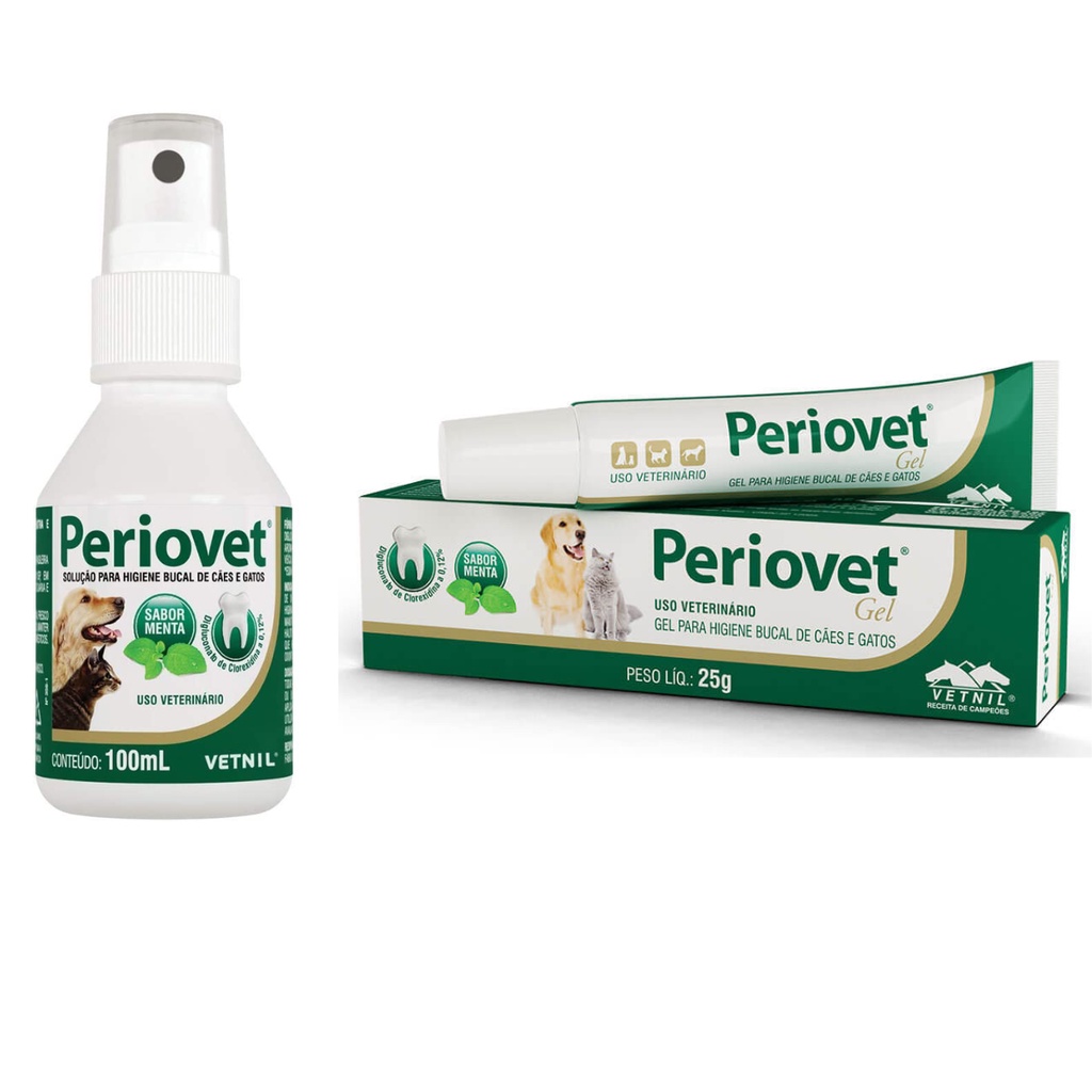Periovet Solução para higiene bucal para cães e gatos. Periovet é uma solução a base de Clorexidina para a higienização oral de cães e gatos. Com sabor menta, Periovet está disponível em apresentações líquida e gel, que possibilita a praticidade para a utilização durante o processo de manutenção da saúde bucal de cães e gatos, seja na clínica ou em domicílio. INDICAÇÃO Periovet é uma solução a base de Clorexidina para higienização oral de cães e gatos. Auxilia na manutenção da saúde bucal e no controle do mau hálito. Integra programa completo de higiene oral que inclui escovação periódica e avaliação odontológica pelo médico veterinário. MODO DE USAR Utilizar de modo a atingir todas as superfícies dentárias e gengivais. Gazes ou escovas são indicadas para facilitar a aplicação. Pode ser utilizado como enxágue bucal. Utilizar especialmente antes, durante e após avaliações e procedimentos na cavidade oral. SPRAY - CADA 100 mL CONTÉM Digluconato de Clorexidina 20%* 0,600 g Aroma menta 1,0 g Veículo q.s.p. 100 mL *Equivalente a 0,120 g de Digluconato de Clorexidina. GEL - CADA 100 g CONTÉM Digluconato de Clorexidina 20%* 1,066 g Aroma menta 0,200 g Veículo q.s.p. 100,000 g *Equivalente a 0,120 g de Clorexidina base. APRESENTAÇÃO Spray contendo 100 mL e bisnagas contendo 25 g.