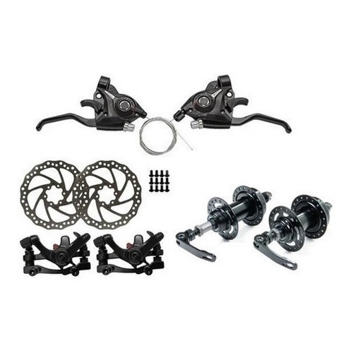 O kit de freio a disco mecânico para 21 velocidades implementa em sua bike um sistema de frenagem diferente do habitual. A precisão da frenagem é o diferencial deste produto em relação aos demais no mercado. A composição das alavancas e das pinças em alumínio torna a bicicleta mais leve, resistente e durante o percurso o peso da bike em conjunto com a velocidade não trazem grandes esforços aos freios, mantendo a durabilidade das pastilhas. A facilidade de manutenção permite tanto a limpeza dos discos, troca dos cabos e a remoção das pinças para a troca das pastilhas. Permita que a sua bike possa lhe mostrar o que há de melhor na questão de desempenho! CARACTERÍSTICAS - Composição das Alavancas e Pinças em Alumínio e Cubos em Aço - Pastilhas Removíveis e Pastilhas Semi-metálicas; - Sistema de Colar de Esferas - Cubos com 36 Furos; - Alavancas para 21 velocidades. DÚVIDAS FREQUENTES 1 - Minha bicicleta não contém uma ou as duas furações para fixar as pinças, o que eu faço? Caso a sua bicicleta não contenha as furações para fixar as pinças, abaixo há o campo de perguntas onde você pode nos fornecer o modelo de sua bike, que nós lhe retornaremos com o kit compatível com os adaptadores para o seu modelo. 2- O cubo aceita raio Inox ou Zincado? Sim, ambos. Os raios precisam somente ser da numeração 2.0 3 - Qual é o tamanho de roda/aro compatível com este kit? Tamanhos 20; 24; 26 e 29. Desde que respeitem as condições das furações. ESPECIFICAÇÕES DOS PRODUTOS Freio a disco de alumínio dianteiro e traseiro 02 Pinças de freio; 02 Disco 160mm; 04 parafusos Allen de fixação da pinça; 12 parafusos Allen p/ fixar disco; Composição: pinça de alumínio e disco 160mm de aço; Marca: PACO ABSOLUTE Cubo Aço para freio a disco preto com esfera (par) Cubos com rolar de esferas; Sistema de BLOCAGENS; Furação do raio: 36 furos para raio até 2.0mm (Raio Fino); Sistema: para uso de roda livre múltipla ROSCA marcha 6/7/8 marchas ; Composição: Aço; Marca: PACO. Alavanca Rapid Fire 21m com maçaneta de freio em alumínio; Modelo: 21 Velocidades v-fire; ComposiÇão: alumínio, aço, pvc; Marca: GTS TEC
