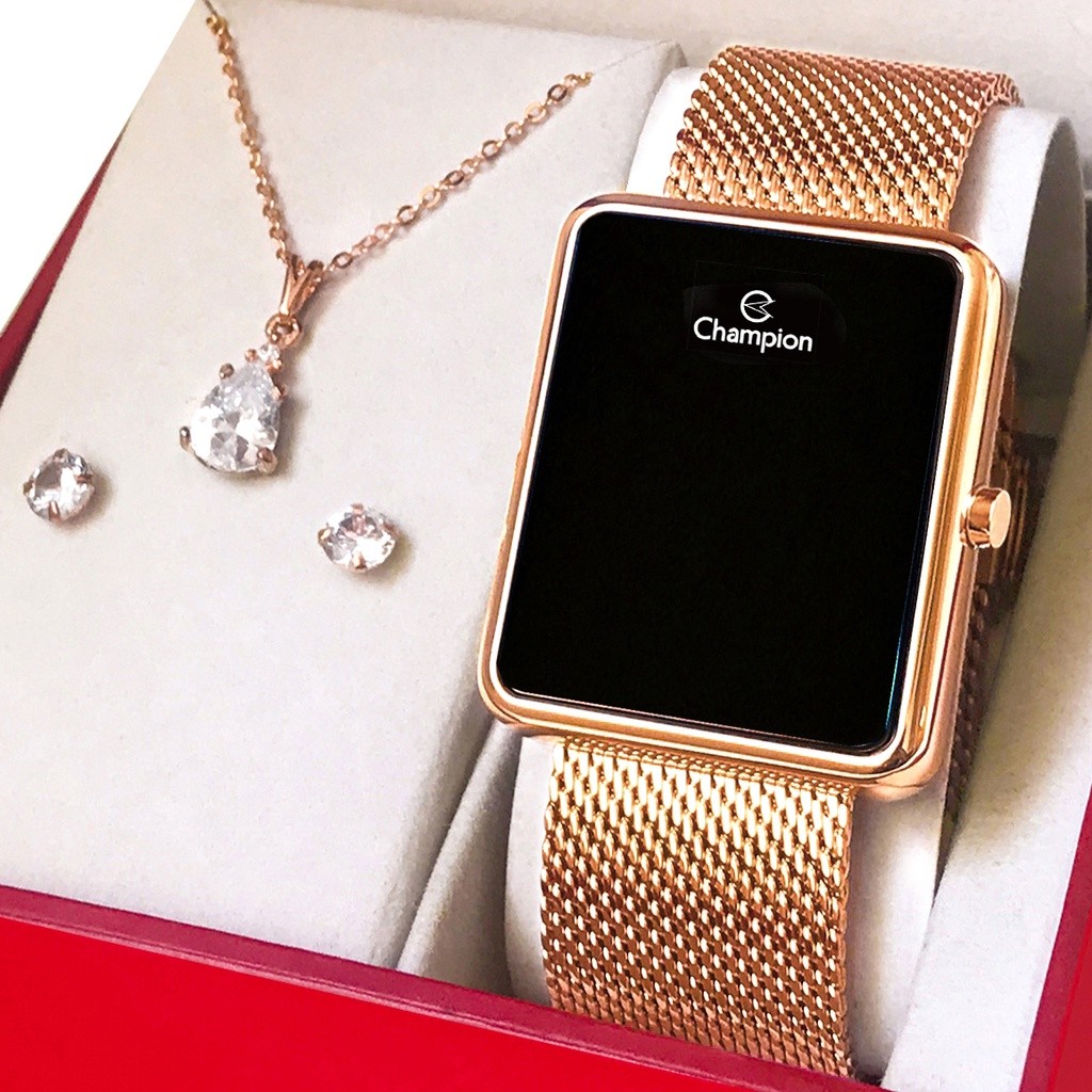 Oi! Tá procurando aquele presente perfeito? Encontrou! Dê o lindo kit Champion de presente para você mesmo, ou para alguém querido! Os relógios digitais estão em alta e combinam com tudo, sem contar que esse modelo acompanha um lindo conjunto de joias como. Top!