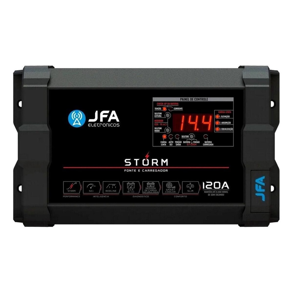 A Fonte e Carregador Storm 120A é mais que uma fonte. Ela é a revolução de tudo o que a JFA já produziu. Equipada com a mais alta tecnologia, compacta e com funções exclusivas, a Fonte Storm é a melhor escolha para carregar, alimentar e também monitorar o funcionamento de baterias automotivas. Ela reúne as principais características das linhas SCI e Redline e inaugura um novo conceito de Fonte Inteligente. Diferenciais da Fonte e Carregador Storm 120A: Função Storm que eleva, por curto tempo, a tensão de saída para 15V, dando a máxima performance ao amplificador; Sistema de Carga Inteligente (SCI) e Sistema de Carga lenta em três fases; Exclusiva função de diagnóstico da bateria, em apenas 10 segundos, através do medidor de CCA e análise real da capacidade de acúmulo de carga; Sistema de ventilação inteligente com controle dinâmico por PWM; Design compacto, menor que as linhas anteriores, e harmônico, ideal para qualquer projeto; Mantém até 6.000 WRMS de som tocando. • Especificações Técnicas Entrada: 90 a 140Vac / 170 a 240Vac (Bi-volt automático) Consumo com máxima carga: 1800W Corrente máxima de saída: 120 Amperes Tensão de saída selecionável: 12,6V / 13,0V / 13,4V / 13,8V / 14,0V / 14,4V SCI - Sistema de carga inteligente: 13,8 / 14,4 cíclico Sistema de carga lenta 3 fases - Personalizavel: Elevação /Absorção/ Equalização Smart cooler - Sistema de ventilação inteligente: Controle dinâmico por PWM Precisão voltímetro / amperímetro: 99% / 96% Proteções: Excesso de carga / Curto na saída / Temperatura Dimensões L x A x P (mm): 279 x 163 x 86 Peso Kg: 2,050