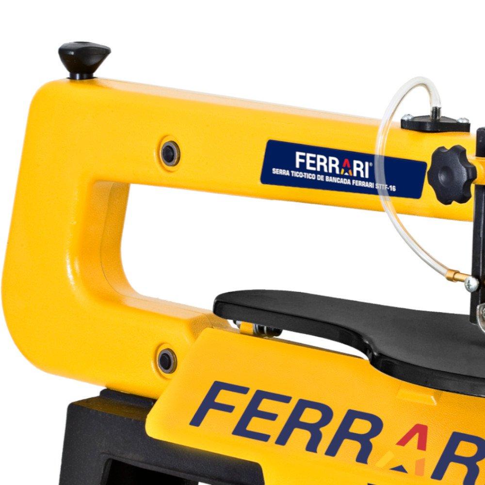 Serra Tico-Tico de Bancada STTF-16 FERRARI Para cortes circulares, angulares e cortes retos em madeira. Aplicação: Ideal para cortes circulares, angulares e cortes retos em madeira. Utilizada em escolas profissionalizantes, marcenarias, artesanatos e fábricas de brinquedos. Benefícios: 2 posições de corte frontal e lateral; Inclinação da mesa de 0° - 45º; Base com borracha para minimizar vibração; Soprador de serragem mais resistente; Máquina silenciosa; Botão seletor de velocidade variável 400 à 1600; Possui saída de serragem para acoplar coletor de pó. Características Técnicas: Potência do motor: 1/6 cv (120W) / 60Hz Rotação do motor: 1700 rpm Tensão nominal: 127V ou 220V (não é bivolt) Velocidade variável: 400 à 1600 rpm Lâmina da serra: 3 x 125 mm (18D/pol) Inclinação da mesa: 0° - 45° Espessura máx. de corte: 90°/ 50 mm / 45°/ 23 mm Dimensões da mesa: 250 x 415 mm Dimensões da embalagem (L x A x C): 325 x 350 x 655 mm Peso: 12/13 Kg Código do Produto: AAS1050007 / AAS1050008 Marca: Ferrari *Imagens meramente ilustrativas.