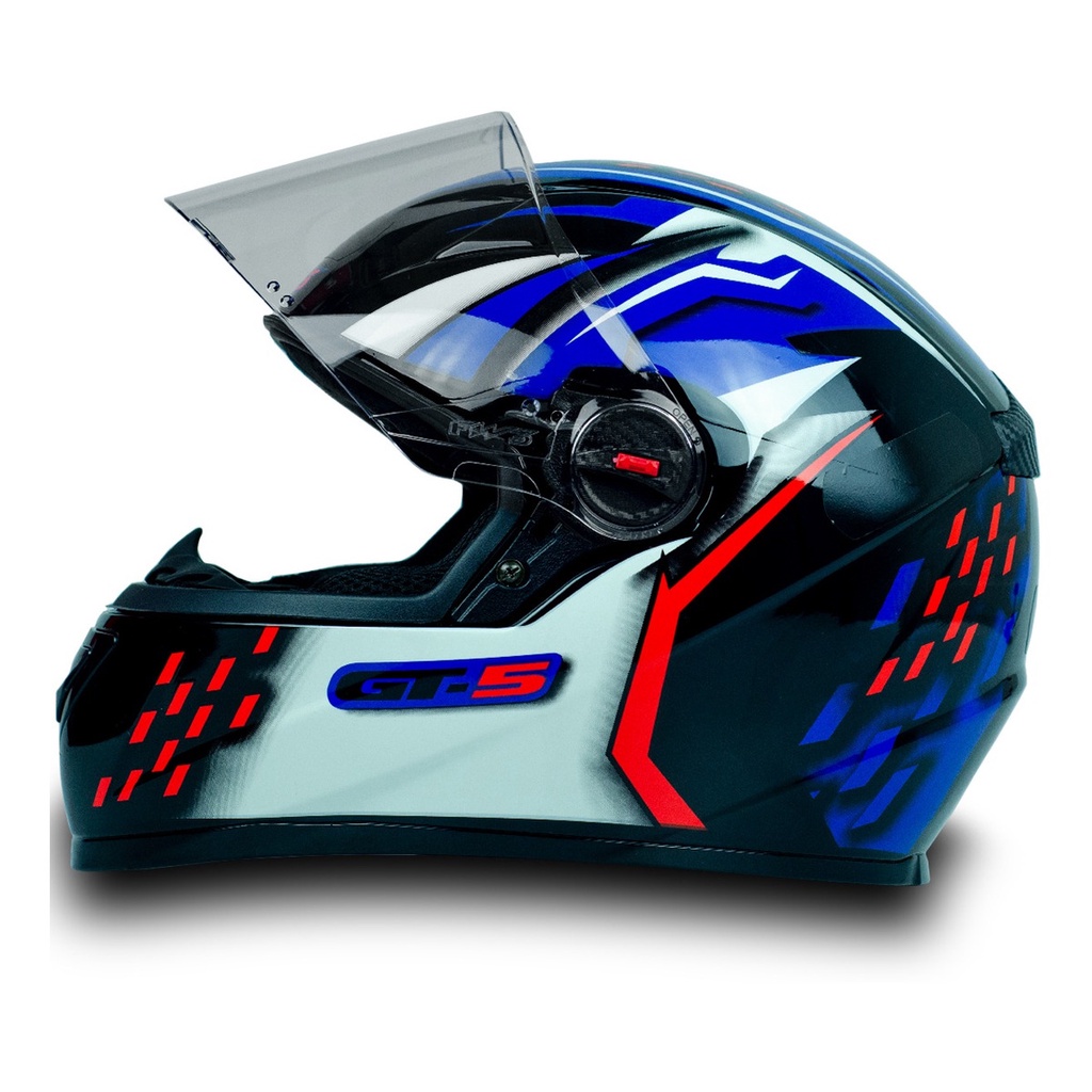 # Auto Equip # Bem-Vindo! * Produtos de Qualidade * Postagens até 24h * Pagamento Facilitado Descrição Capacete Fechado GT5 Preto com Azul, Vermelho e Branco - FW3: Com design esportivo e diferenciado, o capacete FW3 é perfeito para todo motociclista. Leve, estiloso e confortável, este moderno capacete vem com entrada e saída de ar, é fabricado em ABS super resistente e possui certificado de segurança. O melhor para você motociclista andar por aí com muita segurança, conforto e estilo! Características: - Modelo: GT5 - Cor: Preto com Azul, Vermelho e Branco - Tamanho: 56 - Casco em ABS Resistente - Abertura em 2 Estágios - Viseira Transparente em Policarbonato 2.5 mm - Forro Removível - Forração com Espuma de Densidade D28 - Fitas autocolantes internas para Fixar a Bochecheira ao Casco - Com Entrada e Saída de Ar - Com Narigueira - Peso: 1,180 kg - Produto Certificado pelo INMETRO Conteúdo da Embalagem: - 01 Capacete Importante: Garantia de 12 meses. A Auto Equip recomenda que a instalação seja feita por profissional especializado e não se responsabiliza pelo mau uso do produto. - Somente dê o lance se realmente tiver a intenção de comprar. - Utilize o espaço reservado para perguntas e esclareça suas dúvidas. - Nosso primeiro contato será via e-mail. Certifique-se de que seu e-mail cadastrado está correto. - Clique em comprar apenas uma vez e aguarde alguns minutos até receber um e-mail de confirmação do pedido. - Para ter a certeza que seu pedido foi confirmado, acesse sua área restrita e vá em MINHAS COMPRAS, e verá seu pedido. - Não clique em comprar mais de uma vez em hipótese nenhuma, pois gera transtornos para nossa empresa e para você! - Confira sua mercadoria ao receber. *A postagem será feita em 24 horas úteis.