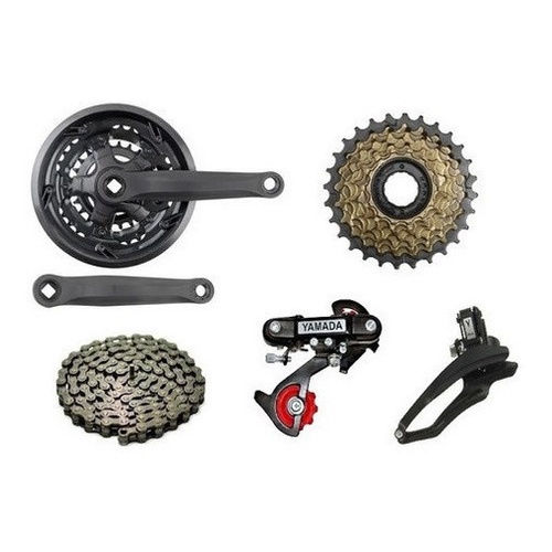 Kit Marcha Para Bike 21v Câmbios Catraca Corrente Pédivela *** Descrição do produto *** Kit de Câmbios de Transmissão para Bicicleta de 21 Marchas. Compatíveis com quadros de aço ou alumínio. Câmbio Traseiro 7v: "SEM" Gancheira Marca: Yamada Cor: Preto Câmbio Dianteiro 3v: Puxa por "CIMA"(Abraçadeira 31,8mm) Marca: Yamada Cor: Preto Corrente: 7v Marca: Importada Cor: Marrom Pedivela: 21v Marca: Ltx Cor: Preto Catraca: 7v Marca: Wg Sports Cor: Marrom/Preto Produto Original!