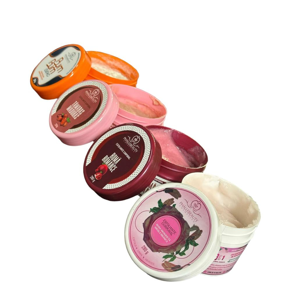 Kit com 4 Esfoliantes Corporais PhalleBeauty 1 Esfoliante Romã Romance280g 1 Esfoliante Rosa Mosqueta 280g 1 Esfoliante Bum Bum Lisinho 280g 1 Esfoliante Tâmaras Maduras280g Categoria: Hidratante Lançamentos informações do produto_PH0592 Modo de usar: Com a pele molhada aplique o produto e massageie suavemente em movimentos circulares e ascendentes, concentre nas áreas mais ressecadas (costas, calcanhares e cotovelos) e enxágue bem. Para melhor resultado use nosso esfoliante corporal tâmaras maduras até 3 vezes na semana. Não aplicar no rosto.
