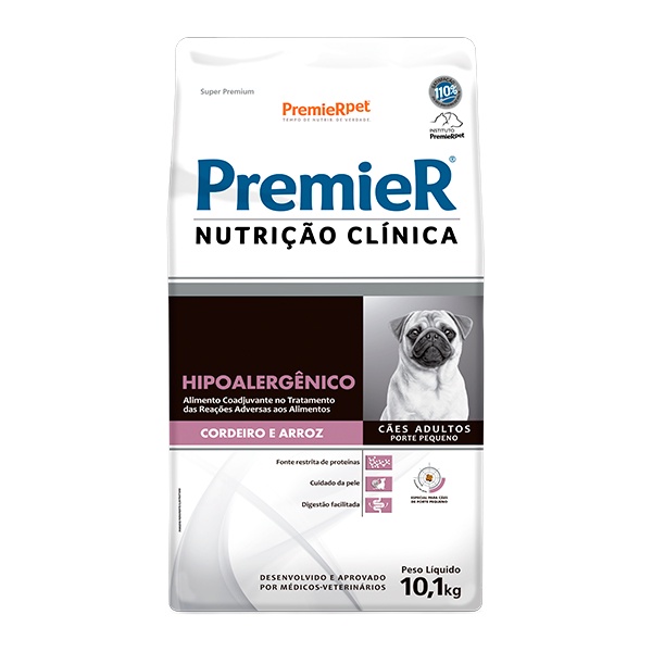 PremieR Nutrição Clínica Hipoalergênico Cães de Pequeno Porte Cordeiro e Arroz é um alimento auxiliar ao tratamento de cães adultos de porte pequeno com reações adversas ao alimento que apresentem sintomatologia dermatológica e/ou intestinal. Por não conter ingredientes com glúten, pode ser indicado para cães com intolerância ao glúten. Além do acompanhamento realizado pelo médico veterinário, é fundamental substituir a dieta por um alimento com menor potencial de causar alergia, reduzindo assim a possibilidade de ocorrência dos sintomas. Este alimento deve ser utilizado sob orientação e prescrição de um profissional pelo período mínimo de 3 a 8 semanas, se os sinais de reações adversas ao alimento desaparecerem, pode ser utilizado continuamente.