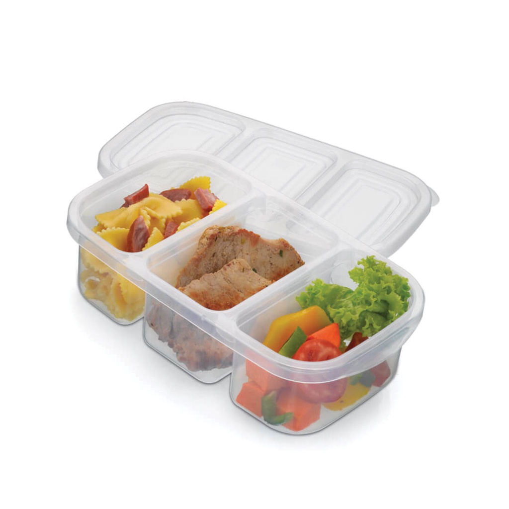 POTE 3 DIVISOES 1,1 LITROS - As cores das tampas que mudam o corpo é transparente do corpo; _______________________________________ DESCRITIVO: Peso: 130 g Largura: 14 cm Comprimento: 24 cm Altura: 7 cm Capacidade: 1,1 L _______________________________________ DIFERENCIAIS: BPA Free (Livre de BPA - O BPA é uma substância química que faz mal à saúde) Design alegre que se adequa em todos os momentos Material incrivelmente resistente _______________________________________