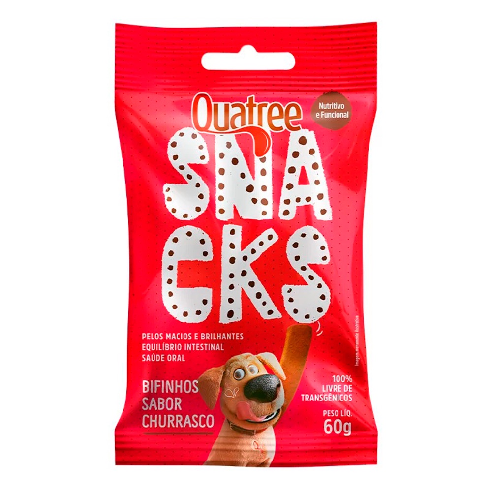 Snack Quatree Bifinho Para Cães Sabor Churrasco - 60g - Indicado para cães; - Para cães de todas as raças; - Auxilia na higiene bucal; - Equilibra a flora intestinal; - Sabor churrasco. Snack Quatree Bifinho Para Cães satisfaz o instinto de mastigação do seu cãozinho e higieniza dos dentes. Contém hexametafosfato de sódio para o controle de tártaro e com o seu prebiótico, equilibra a flora intestinal. Quatree Bifinho Para Cães possui um sabor inconfundível de churrasco faz com que o pet sempre queira mais. O Snack pode ser utilizado como premiação, distração e brincadeira, contribui para diminuição do estresse e proporciona gengivas mais saudáveis. Snack Quatree Bifinho é um petisco de cuidado diário para oferecer com carinho e diversão ao seu cãozinho de todos os portes. Modo de usar Cães de pequeno porte: 2 bifinhos Cães de médio porte: 4 bifinhos Cães de grande porte: 6 bifinhos Composição Carne Mecanicamente Separada (frango), Carne Mecanicamente Separada (bovino), Proteína de Soja, Farinha de Trigo, Farinha Patabilizante de fígado de Frango, Fosfato Bicálcico, Hexametafosfato de sódio (0,03%), Mananoligossacarídeo, Óleo de linhaça, Propileno Glicol, Glicerina Branca bi-destilada USP, Sorbato de Potássio, Ácido Eritórbico, Eritorbato de Sódio, Cloreto de Sódio(sal comum), Nitrito de Sódio, Fosfato Trissódico, Corante Alimentício e Aromatizante.