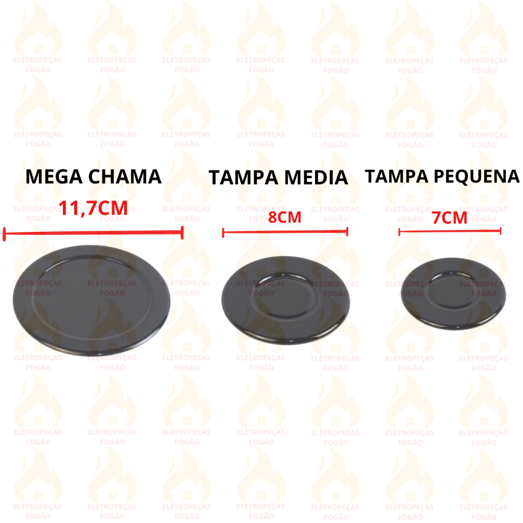 Kit 5 espalhadores tampas para fogão Atlas tropical Kit contém: 1 espalhador mega chama de 11,7 centímetros de diâmetro 2 espalhadores médios de 8,0 centímetros de diâmetro 2 espalhadores pequenos 7,0 centímetros de diâmetro. caso tenha duvidas, verifique a segunda foto do anuncio para confirmar se os espalhadores servem ou não em seu fogão.