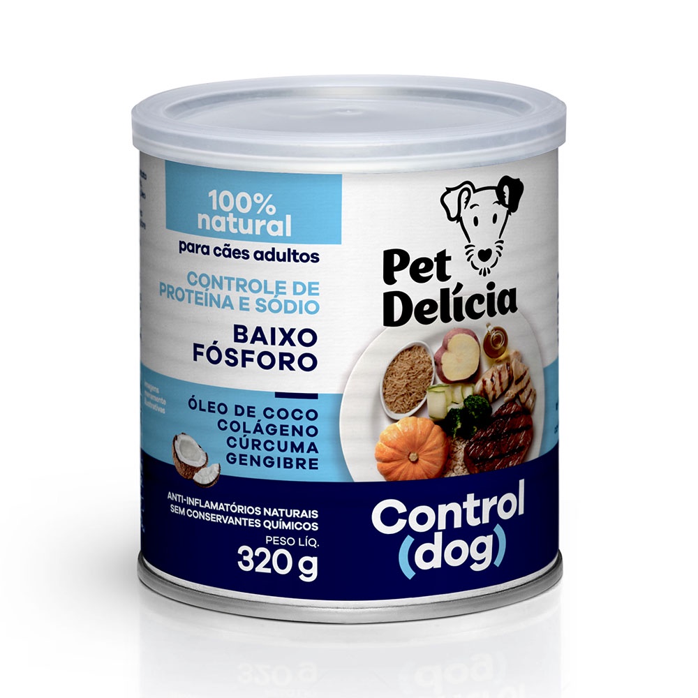 Ração Úmida Pet Delícia Cães Control Dog - 320g - Indiacdo para cães; - Ideal para diminuição de fósforo; - Com colágeno para as articulações; - Sem conservantes e corantes; - Com antioxidantes e anti-inflamatórios naturais. Pet Delícia Control Dog é uma receita desenvolvida por especialistas para cães adultos com uma seleção de carnes nobres e legumes frescos escolhidos para diminuir fósforo e cuidar do organismo. Elaboramos essa receita com baixo fósforo, umidade ideal, baixo sódio e proteína moderada para oferecer uma alimentação rica e 100% natural para cães sensíveis. Além das vitaminas e minerais otimizados, enriquecemos essa receita com colágeno para cuidar das juntas e dos ossos, algas como fontes de ômega 3, gorduras saudáveis através do azeite de oliva e óleo de coco, cúrcuma e gengibre (para prevenir inflamação e melhorar imunidade), maçã (prebióticos e ação anti-inflamatória), e por final aveia, chia e linhaça como fonte de fibras. Selecionamos com cuidados ingredientes naturais e de qualidade para compor cada uma de nossas receitas, levando assim saúde e longevidade para os pets. Recomendação Diária Indicação de consumo sugerida considerando a necessidade calórica diária, sujeito adaptações por atividade física ou metabolismo individual. Para saber exatamente a quantidade de acordo com o peso do seu cão CLIQUE AQUI. Peso (kg) Quantidade diária (g) 1-5,5 90g – 320g (1 lata) 5,5-13,5 320g – 640g (2 latas) 13,5-23,5 640g – 960g (3 latas) 23,5-34 960g – 1280g (4 latas) 34-46 1280g – 1600g (5 latas) Acima de 46 quilos acrescente mais 1 lata para cada 13 quilos de peso do cão. Introduzir de forma gradativa ao longo de 1 semana. Sugere-se adequar a quantidade proporcionalmente como complemento (cada 100g deste alimento equivale aprox. 30g de ração seca). Ingredientes Fontes de proteína: peito de frango, moela de frango, carne bovina, língua bovina Legumes: abobrinha, cenoura, batata doce, abóbora moranga, brócolis, chuchu Óleos: azeite de oliva, óleo de girassol, óleo de coco, lecitina de soja não transgênica Funcionais: maçã, aveia em flocos, linhaça, chia, colágeno, algas, açafrão da terra (curcumina), pimenta preta (piperina), gergelim, gengibre, levedura seca Cereais: arroz parboilizado e arroz integral Enriquecimento: vitaminas e minerais