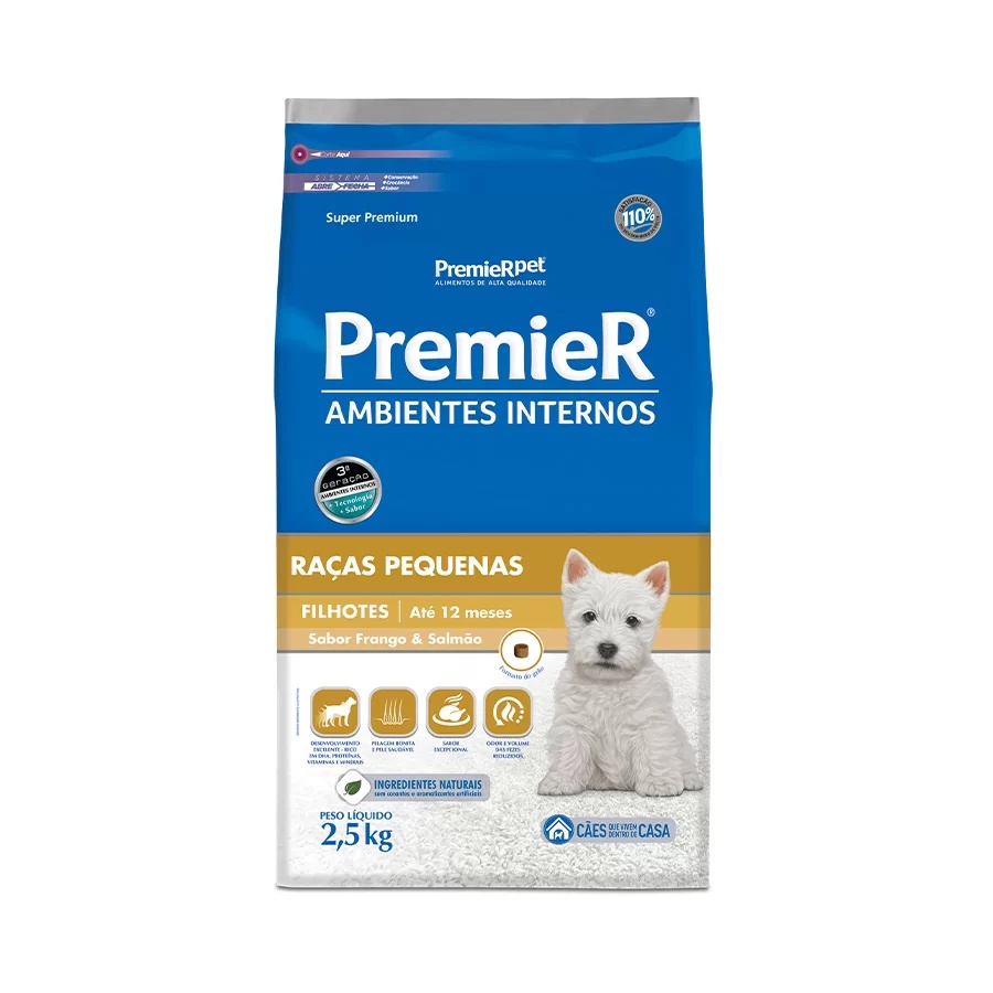 IdadeFilhoteLinhaSuper PremiumPetCachorrosPorte de RaçaPequenoTipoRações SecasSaborFrango e SalmãoApresentaçãoDisponível em embalagens de 1kg, 2,5kg, 7,5kg e 12kgMedidasaproximadasGrão em tamanho real (formato redondo, 6,0mm diâmetro x 5,0mm espessura)IndicaçãoAlimentação diária de cães de pequeno porte que vivem em ambientes internosInformações NutricionaisÁcido fólico 2,08 mg Ácido pantotênico 42,67 mg Biotina 0,80 mg Cobre 20,00 mg Colina 400,00 mg Ferro 88,00 mg Iodo 1,41 mg Manganês 35,20 mg Niacina 64,00 mg Selênio 0,06 mg Vitamina A 24.000 UI Vitamina B1 16,60 mg Vitamina B12 220,00 mcg Vitamina B2 28,00 mg Vitamina B6 9,90 mg Vitamina C 106,67 mg Vitamina D3 1.600 UI Vitamina E 213,00 UI Vitamina K3 2,13 Mg Zinco 144,32 MgNíveis de GarantiaUmidade (máx.) 100 g/kg (10%)Proteína Bruta (mín.) 290 g/kg (29%)Extrato Etéreo (mín.) 190 g/kg ( 19%)Matéria Fibrosa (máx.) 30 g/kg (3%)Matéria Mineral (máx.) 75 g/kg (7,5%)Cálcio (máx.) 15 g/kg (1,5%)Cálcio (mín.) 9000 mg/kg (0,9%)Fósforo (mín.) 8.000 mg/kg (0,8%)Sódio (mín.) 2.000 mg/kg (0,2%)Potássio (mín.) 5000 mg/kg (0,5%)Ômega 6 (mín.) 30 g/kg (3%)Ômega 3 (mín.) 4.000 mg/kg (0,40%)DHA (mín.) 500 mg/kg (0,05%)Energia metabolizável 4213 kcal/kgComposiçãoFarinha de vísceras de frango, farinha de salmão, ovo desidratado, proteína isolada de suíno, quirera de arroz, polpa de beterraba, gordura de frango, gordura suína, óleo de peixe, ácido propiônico, antioxidantes BHA e BHT(0,012%), cloreto de potássio, cloreto de sódio, extrato de yucca (0,06%), frutoligossacarideos, hexametafosfato de sódio, hidrolisado de suíno e frango, levedura seca de cervejaria, mananoligossacarídeos, parede celular de levedura, vitamina A, vitamina B12, vitamina C, vitamina D3, vitamina E, vitamina K3, ácido fólico, ácido pantotênico, biotina, cloreto de colina, niacina, piridoxina, riboflavina, tiamina, cobre aminoácido quelato, ferro aminoácido quelato, iodeto de potássio, manganês aminoácido quelato, proteinato de selênio, sulfato de cobre, sulfato de ferro, sulfato de manganês, sulfato de zinco, zinco aminoácido quelato.