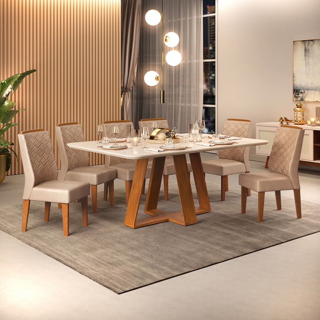 A Mesa Kiara possui um design moderno em formato trapézio inclinado, possibilitando guardar as cadeiras embaixo do tampo, otimizando o espaço da sua sala de jantar. O tampo possui vidro pintado aplicado na madeira com os cantos arredondados tornando a limpeza mais fácil, tornando sua sala de estar mais segura. A Cadeira Lidia possui o assento e encosto estofados. Destaque para o bordado horizontal no encosto que dá um charme especial ao produto. Produzida com matéria-prima de qualidade, sua estrutura reforçada conta com peças em MDF de 1,8 e 2,5 cm de espessura, proporcionando resistência e estabilidade ao produto. Medidas Mesa Largura: 160 cm Altura: 80 cm Profundidade: 90 cm Peso: 56,85 Kg Medidas Cadeira Largura: 46 cm Altura: 102 cm Profundidade: 60 cm Peso: 16,35 Kg Características Técnicas Mesa Produzido em MDP e MDF, materiais que proporcionam maior resistência contra empenamentos Impressão U.V. texturizada fosca e alto brilho, alta definição e maior resistência à umidade. Vidro comum pintado com cantos arredondados colado no tampo de MDF 2,5 cm. Características Técnicas Cadeiras Assento e encosto estofados com espuma de alta densidade que proporciona mais conforto. Encosto levemente inclinado, tornando o produto mais ergonômico. Tecidos tipo Suede, com toque agradável. Observações: Imagens meramente ilustrativas (não acompanha os itens de decoração). As cores do produto podem variar de acordo com monitor e iluminação do ambiente. A DJ Móveis não se responsabiliza pelo serviço de montagem, o produto é enviado desmontado. Produto NOVO, manual de montagem e todos os acessórios necessários para a montagem completa do produto. Perguntas Frequentes: O produto é enviado montado? Todos os produtos da DJ Móveis são enviados desmontados, não realizamos a montagem dos produtos. O produto é novo ou usado? Todos os produtos da DJ Móveis são novos, você receberá o produto novo saindo direto da nossa fábrica. Posso retirar o meu produto em alguma loja física? Não possuímos lojas físicas para retirada de produtos. Qual é o valor do frete? O valor do frete é calculado com base no peso, volume e CEP de destino. Calcule o valor e o prazo de entrega para o seu CEP diretamente no simulador de frete do site. O produto é entregue em qualquer local do Brasil? Sim, entregamos em todo o Brasil através de nossos parceiros logísticos. O produto possui garantia? Sim, todos os produtos da DJ Móveis possuem garantia de 6 meses. Manutenção e Limpeza: Para manter seu móvel novo por muito mais tempo, evite locais úmidos, mantenha-o distante de líquidos e de fontes de calor. Evite a exposição prolongada ao sol. Para limpá-lo utilize uma flanela seca sem produtos abrasivos. Verifique a qualidade de sua parede antes de fixar qualquer móvel nela.
