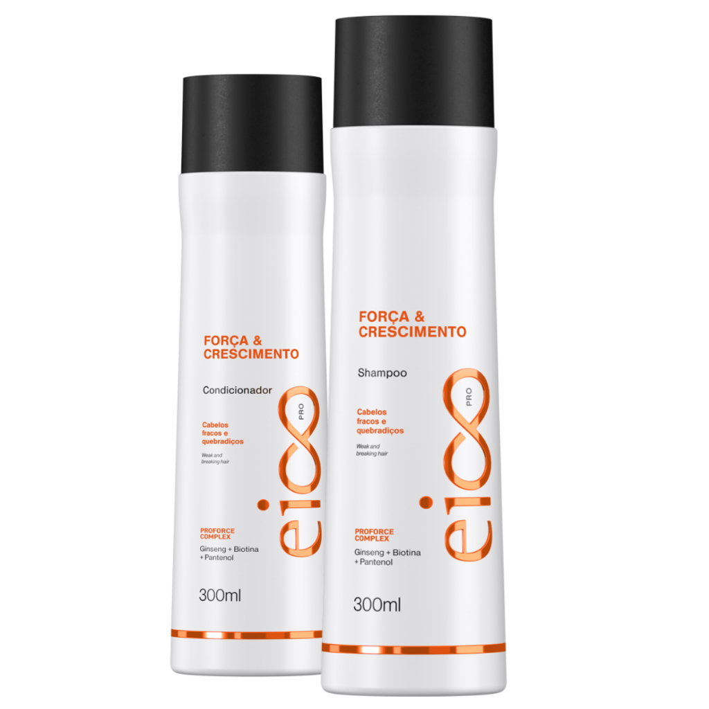 Contém: 1- Shampoo Eico Professional Shampoo Força&Crescimento 300ml 1- Condicionador Eico Professional Força&Crescimento 300ml Sem Sal, Sem Parabenos, Sem Petrolatos, Sem Corante - Linha Liberada A linha Tratamento Força&Crescimento Eico Professional foi desenvolvida para aqueles cabelos com queda, enfraquecidos e quebradiços. Tratamento eficaz combatendo a queda fortalecendo da raiz até as pontas e estimulando muito o crescimento deixando seus cabelos cumpridos e fortes. Ativos: Biotina, Giseng, Pantenol e ProForce Complex Shampoo :Com o cabelo úmido, aplique uma pequena quantidade do Shampoo Tratamento Força&Crescimento sobre a palma das mãos e massageie suavemente por toda a extensão dos fios, da raiz até as pontas. Enxágue completamente e repita a operação. Remova todo o produto dos fios. Para um melhor resultado utilize a linha completa de tratamento EICO PROFESSIONAL Tratamento Força&Crescimento. Condicionador :Após lavar o cabelo com o shampoo EICO Tratamento Força&Crescimento 300ml. Enxágue completamente e retire o excesso de água com uma tolha. Aplique uma pequena quantidade do condicionador EICO Tratamento Força&Crescimento sobre a palma das mãos e massageie suavemente por toda a extensão dos fios evitando a raiz. Enluve mecha por mecha e deixe agir por 3 minutos. Enxágue completamente. Para um melhor resultado utilize a linha completa de tratamento EICO Tratamento Força&Crescimento.