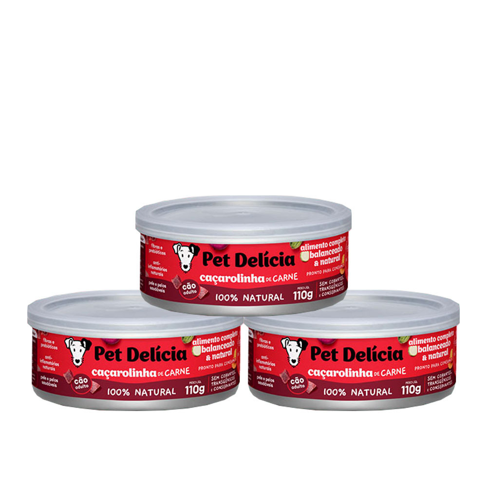 Kit 3 Rações Úmidas Pet Delícia para Cães Caçarolinha de Carne 110g - Indicada para cães; - Alta digestibilidade; - Rico em fibras; - Alimento 100% natural; - Balanceado para cães adultos. A Pet Delicia Caçarolinha de Carne é uma deliciosa receita balanceada para o seu cãozinho. Uma receita elaborada sem grãos, cheirosa e muito saborosa, perfeita para cães exigentes. É feita com carne bovina e enriquecida com legumes, sem conservantes, sem corantes e 100% natural. É feita com cortes nobres da carne bovina, contendo legumes frescos. Possui ingredientes funcionais como algas e aveia em flocos, a fim de proporcionar saúde aos caninos, possui gorduras saudáveis inclusive ômegas 3 e 6 elevando a qualidade da pele do seu animalzinho e realçando o brilho. É uma receita com alta digestibilidade para cães com sensibilidade a arroz e outros grãos. Possui vitaminas e minerais adicionados para que o seu Pet esteja sempre com a saúde perfeita! Recomendação diária Indicação de consumo sugerida considerando a necessidade calórica diária, sujeito adaptações por atividade física ou metabolismo individual. Para saber exatamente a quantidade de acordo com o peso do seu cão CLIQUE AQUI. Peso do animal (kg) Quantidade (g) 1-5 95-320 g 5-13 320-640 g 13-22 640-960 g 22-32 960-1280 g 32-43 1280-1600 g Acima de 43 quilos acrescente mais 1 lata de 320g a cada 15kg de peso do cão. Sugere-se dividir estas quantidades em pelo menos duas porções diárias. Ingredientes Fontes de proteína: carne bovina, coração bovino, língua bovina Legumes: abobrinha, cenoura, batata, beterraba, chuchu Óleos: óleo de girassol, lecitina de soja não transgênica Funcionais: alecrim, aveia em flocos, algas, semente de linhaça, semente de chia, levedura seca, cúrcuma e piperina Enriquecimento: vitaminas e minerais