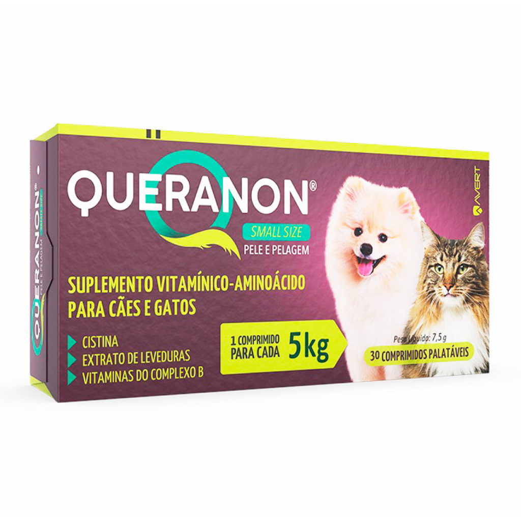 A LeluPets nasceu de uma paixão e dedicação de aproximadamente 20 anos de experiência nessa área tão incrível. Desde o início de nossa história, já são mais de 100 mil clientes atendidos. Estamos aqui determinados em fazer a diferença, democratizando e simplificando o cuidado com o seu pet para oferecer a melhor experiência para você e seu amiguinho. Mantemos nossas orelhas em pé, atentos às novidades do mundo pet para trazê-las até você. Nós somos apaixonados por pets! O seu pet é também da nossa família! Queranon Small Size Avert 30 Comprimidos Cães Gatos Até 5kg A falta de nutrientes em nossos pets, muitas vezes, resulta na queda de pelos e em uma pelagem menos brilhosa e macia. Para recuperar a nutrição ideal, Queranon Small Size é indicado para gatos e cães de pequeno porte em qualquer idade, composto por cistina, pantotenato de cálcio, tiamina e extrato de leveduras e devolve o brilho à pelagem dos animais. - Ideal para cães e gatos; - Alta palatabilidade; - Rico em vitaminas e nutrientes, - Fácil absorção; - Ricos em nutrientes específicos para melhorar o brilho; - Formulação exclusiva para pele e pelagem; - Proporciona nutrientes aos pets; - Melhora o brilho, maciez e qualidade dos pelos; - Atente-se à Queranon Small SIze bula e/ou informações da embalagem; - Consulte um médico veterinário de sua confiança para o uso apropriado deste produto; - Disponível em embalagem com 30 comprimidos palatáveis.