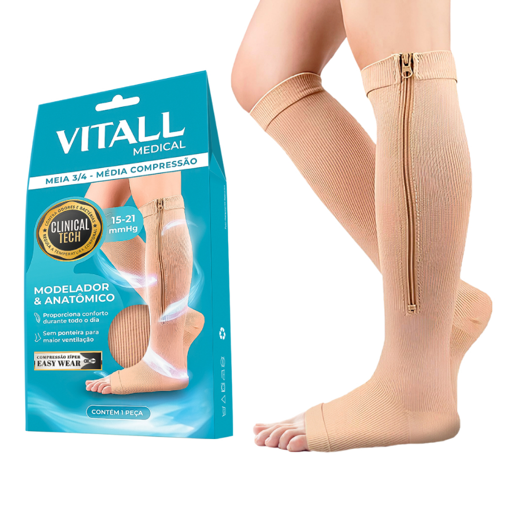 Meia 3/4 Média Compressão Vitall Medical Sem Ponteira 1871 Descrição: A Meia 3/4 Média Compressão Vitall Medical sem ponteira 1871 é projetada para oferecer conforto e suporte para as suas pernas. Disponível nos tamanhos M e G e na cor bege, esta meia proporciona uma compressão moderada de 15-21 mmHg, ideal para cuidados preventivos e terapêuticos. Registro Anvisa: A Meia Vitall possui registro na ANVISA, garantindo mais segurança e qualidade para sua saúde. Confie em quem é aprovado oficialmente para cuidar do seu bem-estar! Registro Anvisa: 82176160017 AFE - Anvisa: 8.21761-6 Características: - Média Compressão; - 15-21 mmHg; - Meia 3/4; - Cor: Bege; - Sem Ponteira; Vantagens: - Calcanhar Verdadeiro: Oferece um ajuste anatômico perfeito, proporcionando conforto e suporte adequado aos pés. - Veste Fácil com Zíper: Facilita o uso, tornando a colocação e a remoção da meia práticas e rápidas. Composição: 90% Poliamida 10% Elastano Indicações: - Inchaço - Dores - Cansaço - Varizes nas pernas Tratamento de Varizes: - Durante e após a gestação - Uso de pílulas anticoncepcionais - Longos períodos em pé ou sentada - Propensão hereditária - Antes e após cirurgias Escolha a Meia 3/4 Média Compressão Vitall Medical para promover a saúde e o bem-estar das suas pernas, aliviando desconfortos e prevenindo complicações circulatórias.