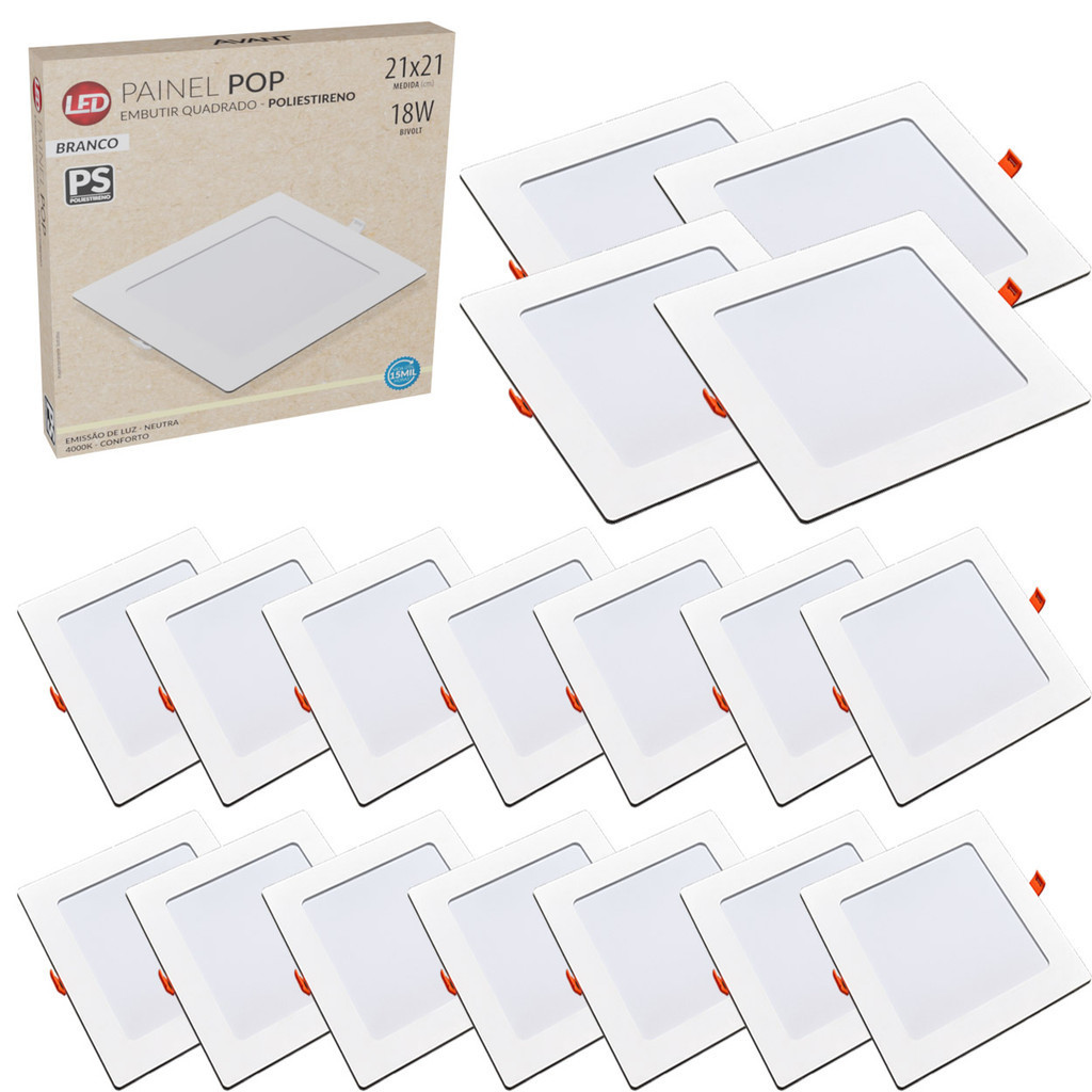 Painel Led Pop de Embutir Quadrado 6500W 18W Avant A linha PAINEL POP EMBUTIR QUADRADO é versátil e pode ser usada em ambientes residenciais, comerciais e corporativos, proporcionando uma iluminação homogênea com design clean e moderno. - Corpo e difusor em policarbonato - Fluxo luminoso constante em toda faixa de tensão. - Baixo consumo de energia. ATENÇÃO: - Na instalação do transformador eletrônico, certifique-se de que o mesmo não ficará em contato com a luminária, pois toda a base da luminária funciona como dissipador de calor, o que pode causar danos e interferências no funcionamento do transformador. - Para melhor fixação do painel POP de embutir, a espessura do forro deve ser de pelo menos 1cm. - Para garantia da vida útil do painel POP, recomenda-se uma distância de pelo menos 10 cm entre o forro e a laje. Referencia: 0775 - Código: 903011374 - Modelo:PAINEL POP QUADRADO EMBUTIR - Marca: Avant - Potência: 18w - Fluxo Luminoso: 1080 Lumens - Eficiência Luminosa: 70lm/w - Ângulo de Abertura: 120 Graus - Temperatura da Cor: 6500K - Emissão de Luz: Branco - Tipo de instalação: Embutir - Temperatura ambiente: -5C a 40C. - Tensão nominal: 100V a 240V. - Fator de Potência: 0,50 Dimensões Aproximadas do Produto: - Altura: 210mm - Largura: 210mm - Comprimento: 16mm *** GARANTIA DE 1 ANO CONCEDIDO PELO FABRICANTE ***