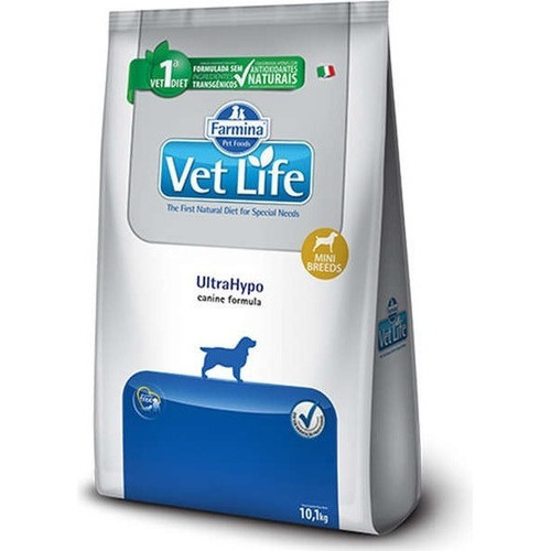 Vet Life Ultra Hypo Mini 10kg: Uma ração terapêutica para cães de mini porte, que auxilia na prevenção e no tratamento de alergias alimentares graves, com proteína hidrolisada de frango, arroz, óleo de peixe e prebióticos, sob prescrição veterinária.
