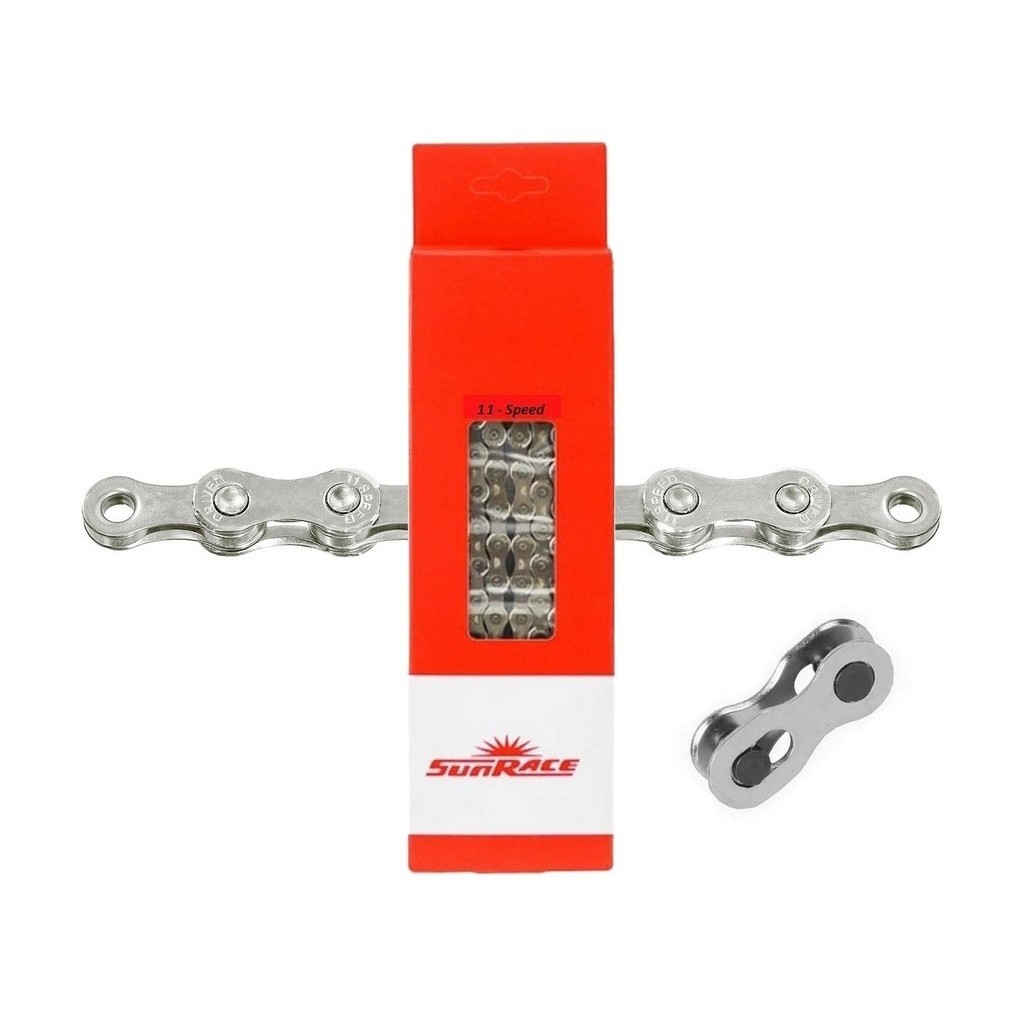 CORRENTE SUNRACE CN11A PRATA 126 ELOS C/ EMENDA - 11V Descrição: A corrente SUNRACE tem um excelente custo x benefício e acompanha emenda rápida (Power Link). Corrente indicada para uso em bicicleta de estrada (SPEED), bicicleta de montanha (MTB), bicicleta recreativa ou bicicleta de uso URBANO. Esse modelo CN11A é exclusivo para relações de 11v e segue com 126 elos. Sendo compatível com todas as combinações de coroas DUPLA ou coroa ÚNICA com cassete até 52 dentes. É compatível com todas as combinações de cassete e coroas de grupos de estrada / Speed. Atenção: ** Acompanha EMENDA, power link. ** Cor: PRATA. ** 126 elos é suficientes para instalação em cassete com 52 dentes com coroa até 38 dentes. Especificações: - Marca: SUNRACE; - Modelo: CN11A; - Medida: 1/2"x11/128” - 126L (elos); - Material: Aço; - Indicado: SPEED, MTB; - Compatível: 11 Velocidades; - Configuração Relação: 2x11v ou 1x11V; - Acompanha EMENDA, power link; - Medida: 126 Elos / Links; - Peso Aproximado: 295g; - Origem: Taiwan; - Part Number: 44029; - Cód. Barras: 4710944262520. Atenção: - Acompanha embalagem Original; - Produto original SUNRACE e acompanha nota fiscal. Aguardamos o seu pedido! INDIAN BIKE SHOP