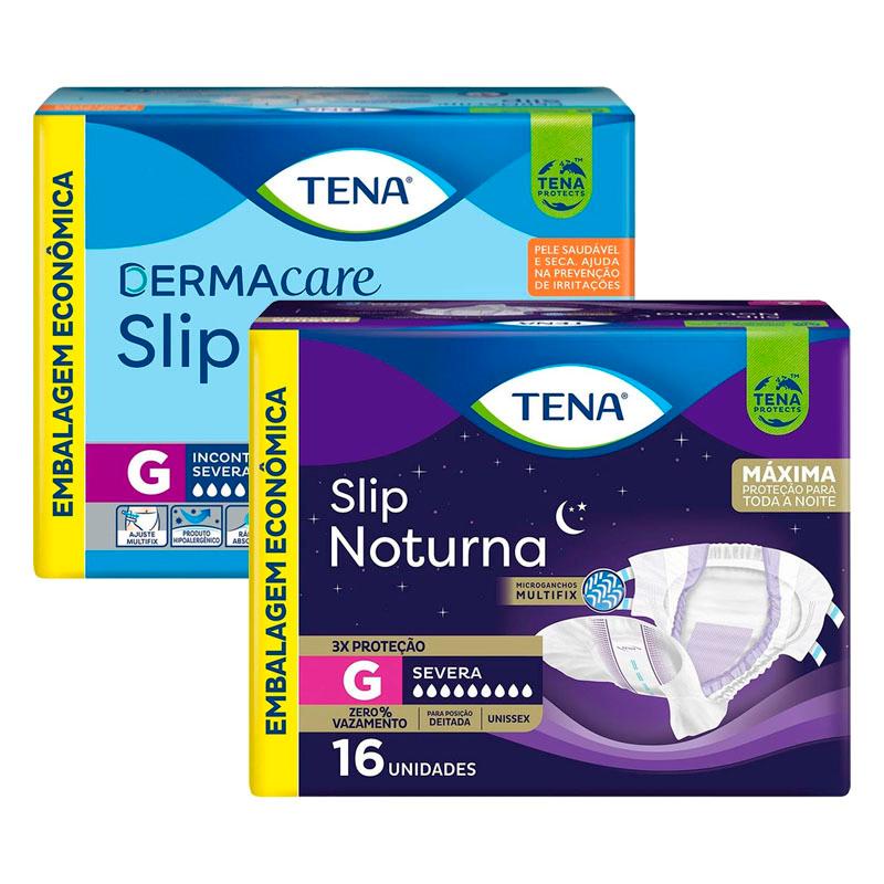 Kit contém: Kit Fralda Geriátrica Tena Dermacare Slip Ultra G com 16 unidades + Fralda Geriátrica Tena Slip Noturna G 16 Unidades Fralda TENA Dermacare possui dupla camada e um núcleo de alta absorção que rapidamente retém a urina promovendo segurança em um produto hipoalergênico. Com tecido macio e respirável que permite a respiração da pele, mantém a mesma sempre seca e saudável, ajudando a prevenir irritações. Possui tecnologia antivazamento com barreiras protetoras, elásticos nas costas e controle antiodor. Indicada para incontinência urinária e fecal em usuários com pouca ou nenhuma mobilidade. • Tamanho: G (92 - 144 cm). • Referência: 70-90 kg.