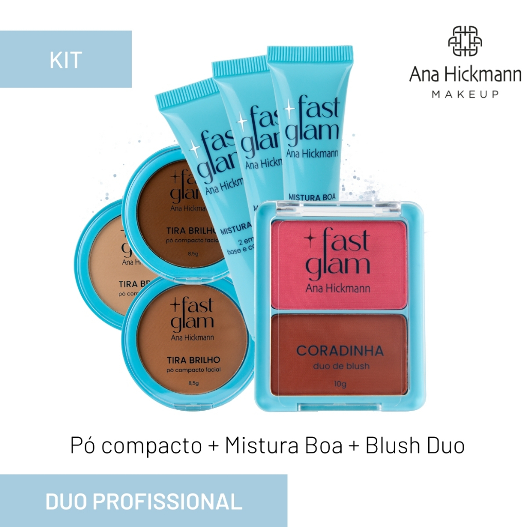 Sinta-se poderosa e confiante com a linha de maquiagens de Ana Hickmann. Produtos para rosto, olhos, boca e acessórios como esponjas, curvex, pincéis profissionais e kits. Produtos de alta performance. Seja a protagonista do seu próprio beauty show! Lançamento 2024 - Pó Compacto Fast Glam Tira Brilho Escolha entre 6 diferentes tipos de tons: C381 - Claro 1 C382 - Claro 2 C383 - Médio 1 C384 - Médio 2 C385 - Escuro 1 C386 - Escuro 2 ----------------------------------------------------------------------------------------------------------------------------------------------------------------- Lançamento 2024 - Fast Glam Mistura Boa Base 2 em 1 Escolha entre 6 diferentes tipos de tons: C373 - Claro 1 C374 - Claro 2 C375 - Claro 3 C376 - Médio 1 C377 - Médio 2 C378 - Médio 3 C379 - Escuro 1 C380 - Escuro 2 ---------------------------------------------------------------------------------------------------------------------------------------------------------------------- Lançamento 2024 - Duo de Blush Coradinha Fast Glam! C389 - Rosada