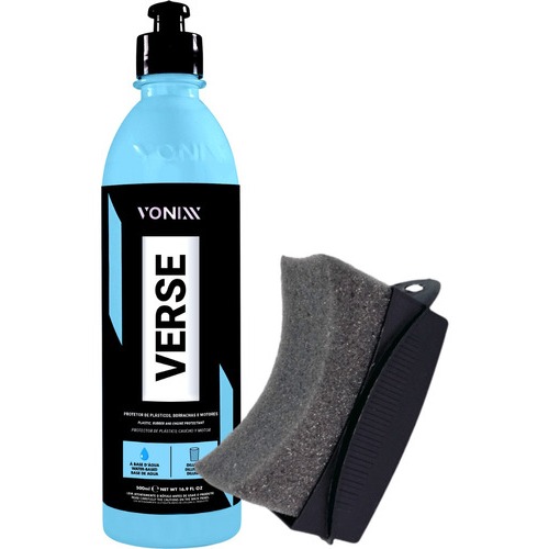 1- VERSE 500ML VONIXX 1- APLICADOR DE PRETINHO DETAILER ----------------------------------------------------------- VERSE 500ML VONIXX DESCRIÇÃO: VERSE é um renovador de plásticos à base d´água que condiciona e protege o material contra raios UV. MODO DE USO: 1-Limpar bem a superfície. 2- Diluir o produto conforme a tabela indicativa. Colocar a solução em um pulverizador. 3- Pulverizar na superfície e realizar acabamento com aplicador de espuma ou toalha de microfibra.