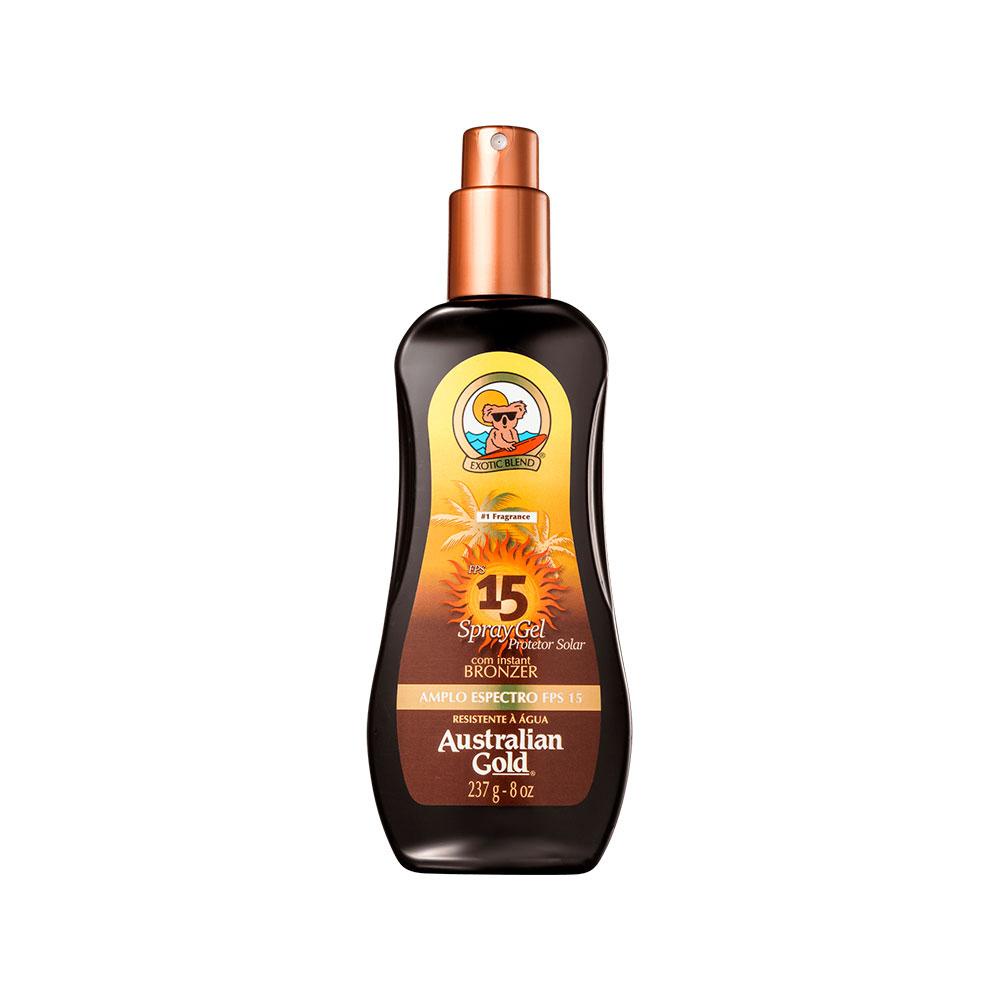 Protetor Solar Corporal FPS 15 da marca Australian Gold promove um bronzeado Instantâneo, que oferece uma suave coloração dourada à pele, e alta qualidade em proteção solar. Além disso, ele proporciona uma pele macia e perfumada. * RESULTADO: Hidratante * SUGESTÕES DE USO: Agite antes de usar; Borrife sobre a pele; Faça numa distância de 10cm a 15cm; Espalhe uniformemente. * OBSERVAÇÕES: Imagem Meramente Ilustrativa * ITENS INCLUSOS: 1 Australian Gold Protetor Solar Corporal FPS15 237g