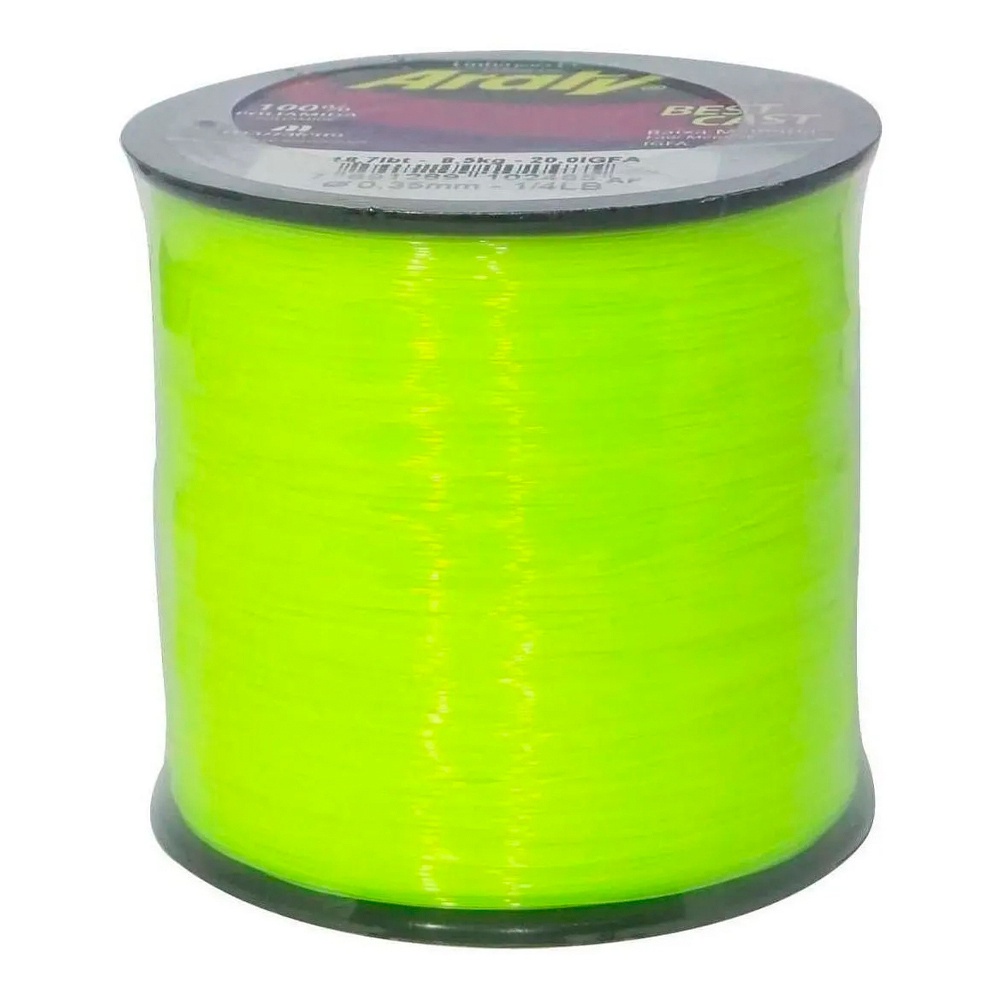 A linha Araty Best Cast é a melhor opção para quem pesca com iscas artificiais. A baixa memória permite movimentos ágeis e, ao mesmo tempo, combina a sensibilidade e a elasticidade para o pescador fisgar no momento certo e lutar com o peixe. Aplicações Best Cast foi elaborada para uso em carretilhas, com ampla gama de diâmetros e cores. Ideal para quem se orgulha da técnica e gosta de reproduzir as condições de torneios. Diferenciais Baixa memória Alta maciez Elevada resistência à ruptura Características Tecnologia desenvolvida para arremessos precisos Alta visibilidade devido às suas cores vibrantes Baixa memória e alta resistência Ampla gama de diâmetro e cores disponíveis A querida de muitos pescadores profissionais no Brasil ESPECIFICAÇÕES: Marca: Araty Modelo: Best Cast Tipo: Monofilamento Material: Nylon copolímero Carretel: 100 g Cor: Amarelo Fluorescente (alta visibilidade) Uso: Carretilha Memória: Baixa Maciez: Alta Elasticidade: Controlada ARATY BEST CAST 0,20mm 6,6lb / 3,0kg - 2.619 Metros 0,25mm 10,2lb / 4,6kg - 1.739 Metros 0,30mm 14,8lb / 6,7kg - 1238 Metros 0,35mm 18,1lb / 8,2kg - 926 Metros 0,40mm 24,3lb / 11,0kg - 719 Metros 0,45mm 27,8lb / 12,6kg - 574 Metros 0,50mm 35,7lb / 16,2kg - 469 Metros 0,55mm 47,2lb / 21,4kg - 390 Metros 0,60mm 53,1lb / 24,1kg - 330 Metros 0,70mm 61,3lb / 27,8kg - 245 Metros 0,80mm 78,3lb / 35,5kg - 189 Metros Observação: A linha Araty Best Cast Mazzaferro é comercializada por peso, portanto, a metragem varia conforme a bitola (diâmetro) da linha.