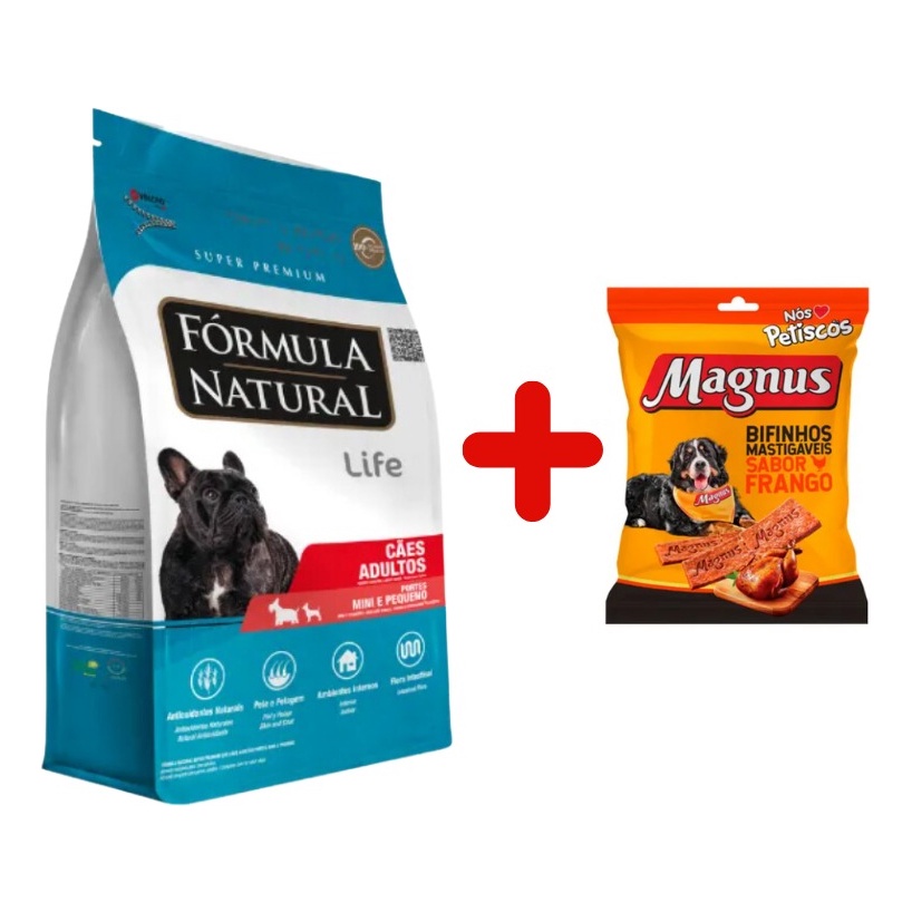 KIT 1 x RAÇÃO FORM. NAT. AD. MIN PEQ 15kg + 1 x MAGNUS BIFINHO MASTER FRANGO 500G PRODUTO ORIGINAL COM NOTA FISCAL! - - - - - DESCRIÇÃO: Um alimento ideal para seu doguinho que está na fase adulta. Age diretamente no auxilio do controle da formação de tártaro, por conta do hexametafosfato de sódio, presente na composição. Conta ômegas 3 e 6, além de zinco quelatado e biotina, componentes que deixam a pele e pelagem mais bonita e brilhante. Uma refeição que proporciona saúde, qualidade de vida e longevidade para seu amiguinho. Os Bifinho Magnus para Cães Adultos Sabor Frango são perfeitos para proporcionar momentos de alegria e diversão para o seu amigão sem abrir mão da saúde. Ofereça diariamente como agrado, recompensas e treinamento. - - - - - MODO DE USO: Ao trocar o alimento de seu pet, faça-o através de um período de transição de aproximadamente 7 dias. A troca pode ser oferecida gradativamente da seguinte maneira: Do 1º ao 2º dia, ofereça 25% da nova ração com 75% do alimento habitual de seu pet. Do 3º ao 4º dia, misture 50% da nova ração e 50% do alimento habitual. Do 5º ao 6º dia, aumente para 75% da nova ração a 25% do alimento habitual. No 7º dia deve ser oferecido 100% do alimento novo escolhido. Os Bifinho Magnus Mastigáveis Sabor Frango para Cães não substituem o alimento completo. Indicado para o processo de adestramento do seu pet - - - - - Enviamos o seu pedido o quanto antes possível! Obrigado pela preferência.