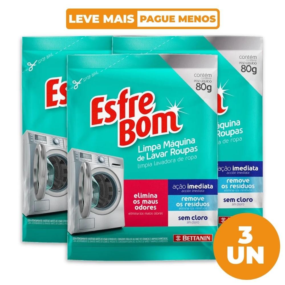 Limpa Máquina de Lavar Roupas 80g EsfreBom Bettanin - Limpeza Impecável e Eliminação de Maus Odores Garanta a durabilidade e o bom funcionamento da sua máquina de lavar roupas com o Limpa Máquina de Lavar Roupas 80g EsfreBom Bettanin. Ideal para a limpeza interna, este produto inovador remove resíduos acumulados e elimina os maus odores, mantendo sua lavadora sempre limpa e higienizada. Com ação imediata e sem cloro, o EsfreBom Bettanin é eficaz na remoção de sujeiras difíceis e proporciona um frescor duradouro. Aumente a vida útil da sua máquina e desfrute de roupas mais limpas e sem odores. Perfeito para uso mensal, este produto é essencial para manter sua rotina de lavanderia sempre impecável! Benefícios: Limpeza profunda: remove resíduos e impurezas da máquina de lavar. Elimina maus odores: mantém sua lavadora livre de cheiros desagradáveis. Sem cloro: ação eficiente sem agressão aos componentes da máquina. Praticidade: ação imediata, sem necessidade de enxágue extra. Compre agora e preserve o bom desempenho da sua máquina de lavar com o Limpa Máquina de Lavar Roupas EsfreBom Bettanin! Acompanha 5 unidades.