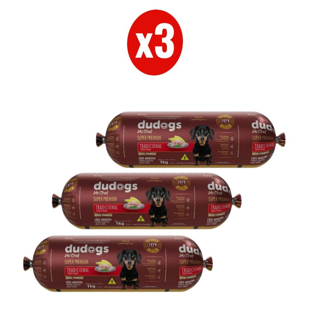 PRODUTO ORIGINAL COM NOTA FISCAL! 3 x DUDOGS TRADICIONAL 1KG - - - - - Descrição: Dudogs é uma marca tradicional de alimento que, desde 1979, contribui para a saúde dos cães, com refeições completas e balanceadas, de elevada digestibilidade e palatabilidade. Dudogs Mr. Chef Super Premium Tradicional é um alimento completo e balanceado, do tipo semi-úmido, indicado para cães adultos. Carne mecanicamente separada de aves, fígado de aves, farelo de glúten de milho* 60, fubá de milho*, óleo de soja** refinado, cloreto de sódio, sacarose, alho, fosfato bicálcico, extrato de yucca, extrato de levedura Saccharomyces cerevisiae, glicerina, ácido cítrico, tripolifosfato de sódio, pirofosfato ácido de sódio, propionato de cálcio, nitrito de sódio, nitrato de sódio, sorbato de potássio, butilhidroxitolueno (BHT), ácido fólico, ácido pantotênico, biotina, cloreto de colina, niacina, piridoxina, riboflavina, tiamina, vitamina A, cianocobalamina, vitamina D3, vitamina E, vitamina K3, iodato de cálcio, selenito de sódio, sulfato de cobalto, sulfato de cobre, sulfato de manganês, sulfato de zinco, sulfato de ferro. *Espécies doadoras de gene: Agrobacterium tumefaciens, Bacillus thuringiensis, Streptomyces viridochromogenes e Zea mays. **Espécies doadoras de gene: Agrobacterium sp. - - - - - Modo de Uso: O alimento está pronto para ser servido. Recomenda-se ralar o alimento ou fatiá-lo em pedaços para auxiliar na apreensão e mastigação pelo cão. Ofereça a quantidade diária recomendada dividida em no mínimo duas refeições. As recomendações são apenas uma orientação e podem variar dependendo do cão e do ambiente em que ele vive. Deixe sempre água limpa e fresca à disposição do cão e leve-o regularmente ao Veterinário e/ou consulte um Zootecnista. - - - - - Enviamos o seu pedido o quanto antes possível! Obrigado pela preferência.
