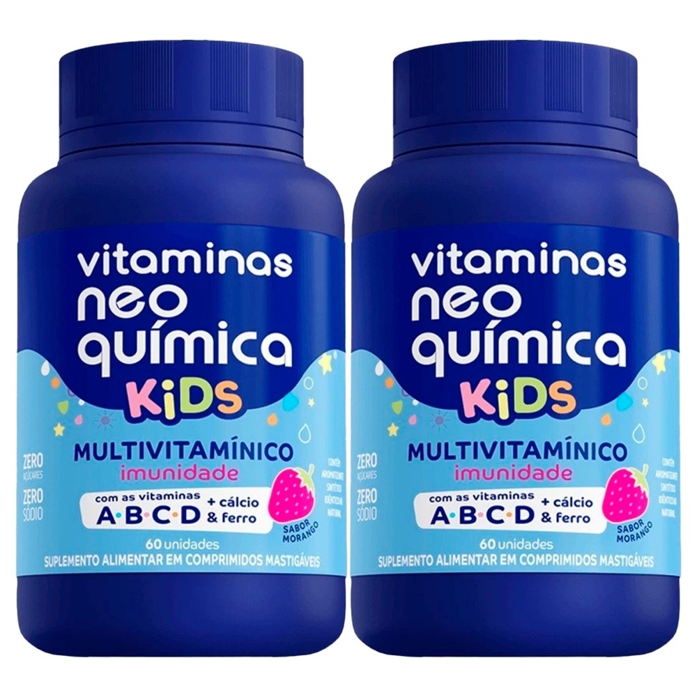 Kit 2 und Vitaminas Neo Kids Morango Mastigável 60 Comprimidos As Vitaminas Neo Kids são formuladas especialmente para atender as necessidades nutricionais das crianças a partir de 4 anos. Com sabor delicioso de morango e na forma de cápsulas mastigáveis, este suplemento proporciona uma maneira fácil e saborosa de garantir que os pequenos recebam as vitaminas essenciais para um crescimento saudável. Principais Benefícios: Nutrição Completa: Contém uma combinação equilibrada de vitaminas A, B2, B6, B12, C e D, além de cálcio e ferro, que são fundamentais para o desenvolvimento físico e mental das crianças; Saúde Óssea: O cálcio e a vitamina D trabalham em sinergia para fortalecer os ossos e dentes, promovendo uma estrutura óssea saudável; Fortalecimento do Sistema Imunológico: As vitaminas C e A contribuem para o fortalecimento das defesas naturais, ajudando a proteger as crianças contra infecções. Apresentação: Disponível em frascos com 60 comprimidos mastigáveis e 240ml. A partir de 4 anos: Recomenda-se a ingestão de 2 a 3 comprimidos mastigáveis por dia, preferencialmente durante uma refeição. Recomendação: Uso diário para garantir uma nutrição adequada e um desenvolvimento saudável. Sabor Atraente: Com sabor morango, as cápsulas mastigáveis tornam o consumo mais agradável, incentivando as crianças a manterem uma rotina saudável.
