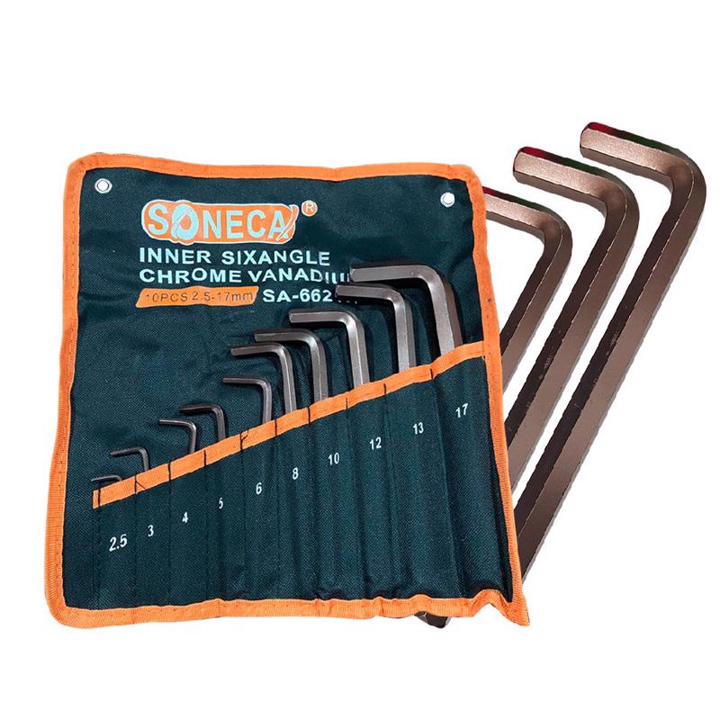 COMERCIAL VIPASA DISTRIBUIDORA. JOGO DE CHAVES ALLEN 10PCS CHROME VANADIUM 2.5 - 17MM Descrição 10 chaves para te acompanhar nas mais diversas atividades! Acompanham um chaveiro para que não se percam ao longo do tempo. Possibilita que se mantenham todas juntas pra evitar esquecer um tamanho específico. Tem construção em L possibilitando um maior torque na utilização, são fabricadas em aço carbono de alta qualidade que traz resistência e durabilidade para o equipamento. Medidas: - 2,5mm - 3mm - 4mm - 5mm - 6mm - 8mm - 10mm - 12mm - 13mm - 17mm Modelo: SA6621H Marca: SONECA COMERCIAL VIPASA DISTRIBUIDORA.