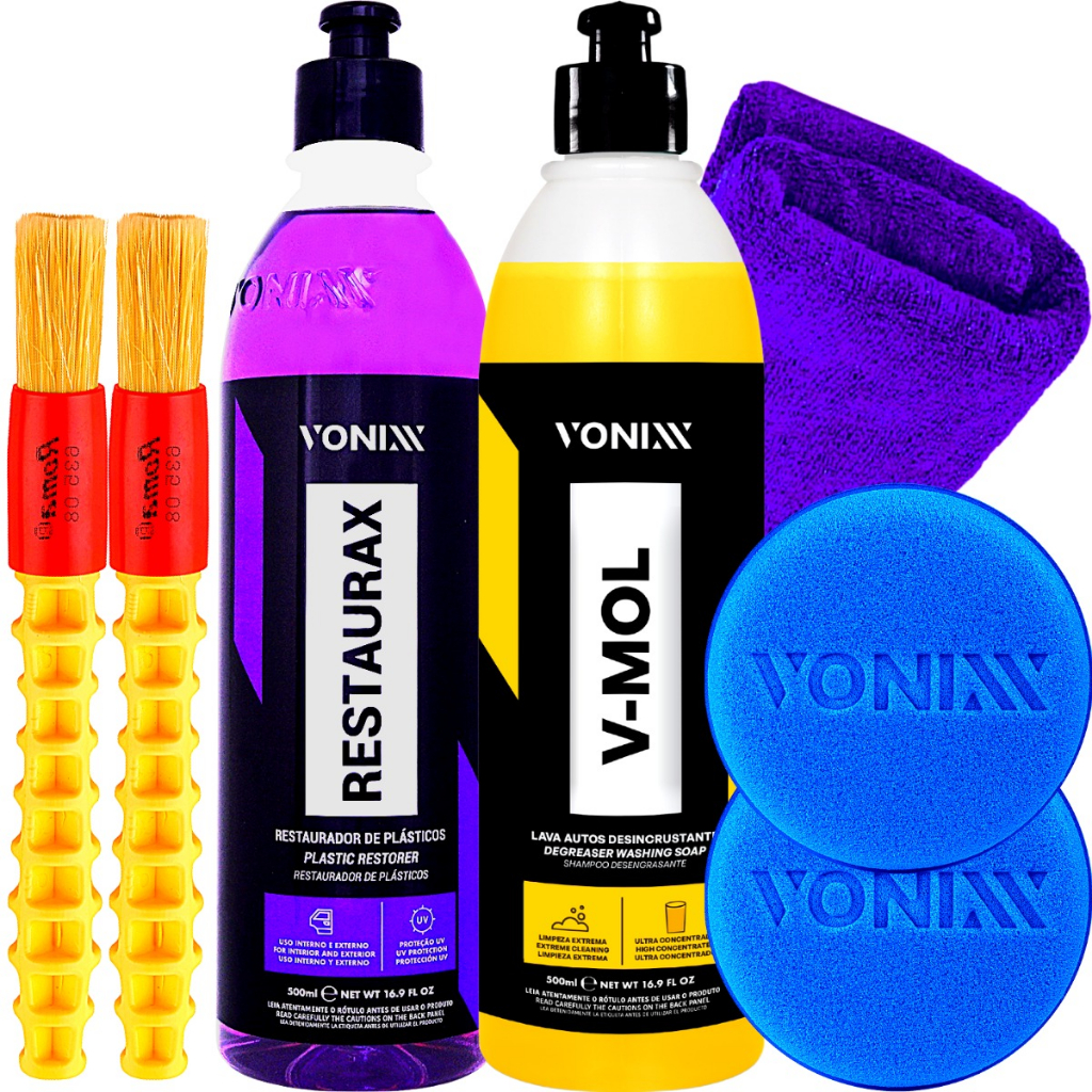 KIT CONTÉM: RESTAURAX 500ML V-MOL 500ML PANO 40X40CM APLICADOR VONIXX 2 PINCEL ROMA -------------------------------------------------------------------- RESTAURAX 500ML - RESTAURADOR DE PLÁSTICOS DESCRIÇÃO: Restaurax renova e restaura superfícies plásticas, como para-choques, painéis e laterais de portas. Sua fórmula contém polímeros especiais que também protegem as peças contra as ações do tempo, evitando degradação precoce do material. DURABILIDADE: Até seis meses de proteção nos plásticos internos e sessenta dias nos plásticos externos. MODO DE USO: 1. Limpar bem a superfície e em seguida aplicar o produto com um aplicador de espuma até a completa restauração. Se necessário, repetir a operação. 2. Para manter o plástico sempre novo, repetir a aplicação do produto a cada 60 dias na parte externa e a cada 6 meses na parte interna. Obs: Para um resultado com menos brilho, realizar acabamento com uma microfibra. -------------------------------------------------------------------- V-MOL 500ML - LAVA AUTOS DESINCRUSTANTE DESCRIÇÃO: Produto lava autos desincrustante com pH levemente básico que não agride a superfície do veículo. Excelente na remoção de sujeiras mais difíceis como remoção de barro e óleo DILUIÇÃO: Sujeira leve/manutenção: 1:100 Sujeira Média: 1:50 Sujeira pesada 1:10 MODO DE USO: 1. Diluir o produto na proporção indicada. 2. Iniciar a lavagem com o auxilio de uma luva de mcrofibra, sempre começando pelas partes superiores do veículo 3. Mergulhar a luva na solução e esfregar suavemente até completar o veículo 4. Enxaguar em seguida até a retirada de todo o produto 5. Secar o veículo por completo a fim de evitar manchas