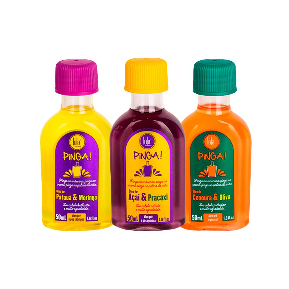 A Linha é indicada para cabelos detonados por químicas agressivas como coloração ou descoloração. Melhora a permeabilidade à umidade, a capacidade de retenção de água e possui propriedades antioxidantes. Promove hidratação, fortalecimento dos fios, proteção da cor e brilho. Inovamos cada vez mais em tecnologia, comunicação, sustentabilidade e compromisso com o meio ambiente! * RESULTADO: Nutrição. * SUGESTÕES DE USO: 1.Aplique algumas gotas na palma das mãos; 2.Esfregue uma na outra; 3.Distribua uniformemente pelo comprimento e pontas. Dica: Também pode ser aplicado, depois da lavagem, antes do uso do secador, baby liss ou piastra, para proteção térmica e brilho. * OBSERVAÇÕES: Imagem Meramente Ilustrativa * ITENS INCLUSOS: 1 Lola Cosmetics Pinga! Açaí e Pracaxi Óleo Capilar 50 ml; 1 Lola Cosmetics Pinga! Cenoura & Oliva Óleo Capilar 50 ml; 1 Lola Cosmetics Pinga! Patauá & Moringa Óleo Capilar 50 ml.