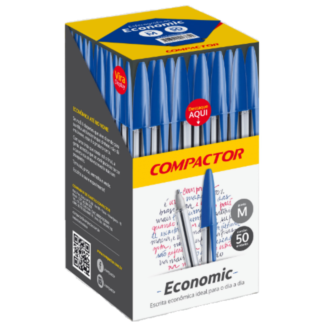 Especificações técnicas: Marca: Compactor; Referência: 000871001; Características do Produto: Caneta esferográfica 1.0mm, corpo sextavado e transparente que permite a visualização do uso da tinta, escrita macia e firme; Embalagem: 1 Caixa Com 50 Unidades cor azul. Descrição: Apresente aos seus clientes a caneta esferográfica Economic 1.0mm azul da Compactor, em caixa com 50 unidades! Com escrita suave e durabilidade, essa caneta é ideal para uso diário. Garanta um produto confiável e muito desejado, aumentando a eficiência das suas vendas!