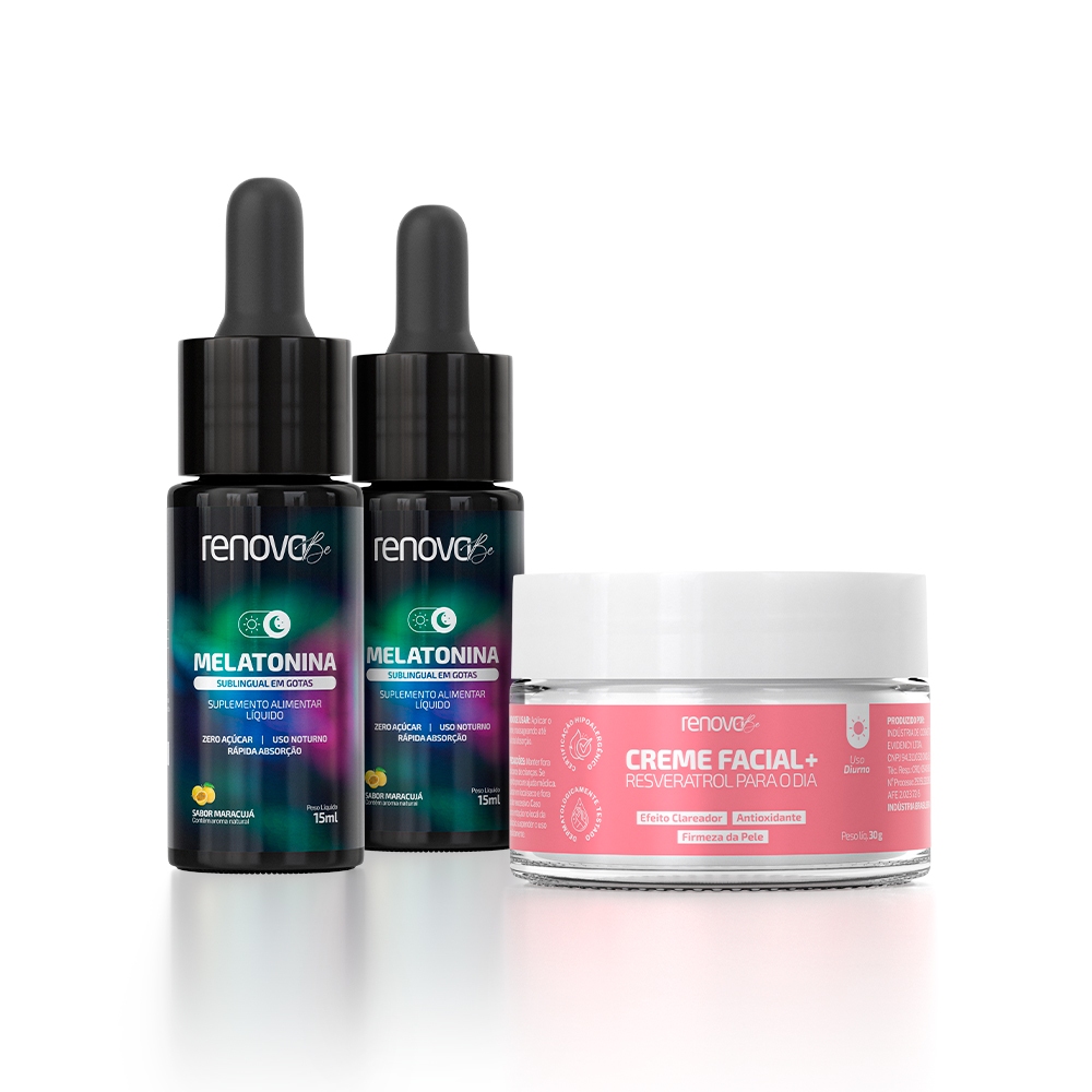 COMPOSTO POR 2 MELATONINAS + 1 CREMEM FACIAL RESVERATROL - CADA FRASCO CONTÉM 15ml - CADA POTE CONTÉM 30g A Melatonina Renova Be é um suplemento natural em gotas projetado para auxiliar na melhora da qualidade do sono. Sua função principal é ajudar na indução do sono de maneira natural, auxiliando no ajuste do ciclo sono-vigília e do ritmo circadiano. Recomendada para pessoas com distúrbios do sono, pode ser usada diariamente por adultos em busca na ajuda para noites bem dormidas. Além de auxiliar o sono restaurador, a Melatonina Renova Be ajuda a estimular ondas lentas do sono e de um sono profundo e sem interrupções. Seu efeito auxilia na reparação de danos celulares causados por fatores externos. O modo de uso sugere uma gota diária à noite, 30 minutos antes de dormir, com recomendação de uso por no mínimo 3 meses para resultados eficazes e contínuos. Dê ao seu corpo o descanso que ele merece, escolhendo a qualidade da Melatonina Renova Be. O Creme facial + Resveratrol Renova Be contendo Nano Resveratrol, Hydrovance, Ácido Hialurônico e Pantenol auxilia no alcance de uma hidratação profunda, ajuda na redução de rugas e aumento da produção de ácido hialurônico. O Nano Resveratrol auxilia na proteção contra danos de radicais livres, enquanto estimula o colágeno. O Hydrovance hidrata, auxilia no aumento da elasticidade e renovação das células. Já o Ácido Hialurônico ajuda a manter a pele firme e hidratada, prevenindo a flacidez. O D-Pantenol promove hidratação e previne sinais de envelhecimento precoce. Para utilizar, aplique uma fina camada do creme na pele limpa e seca pela manhã, massageando de dentro para fora até completa absorção. Não se esqueça de aplicar protetor solar. Além disso, é importante manter o produto fora do alcance de crianças, procurar ajuda médica em caso de ingestão, armazenar em local seco e fresco, e interromper o uso em caso de irritação. Descubra a alegria de uma pele radiante com o toque suave do Resveratrol.