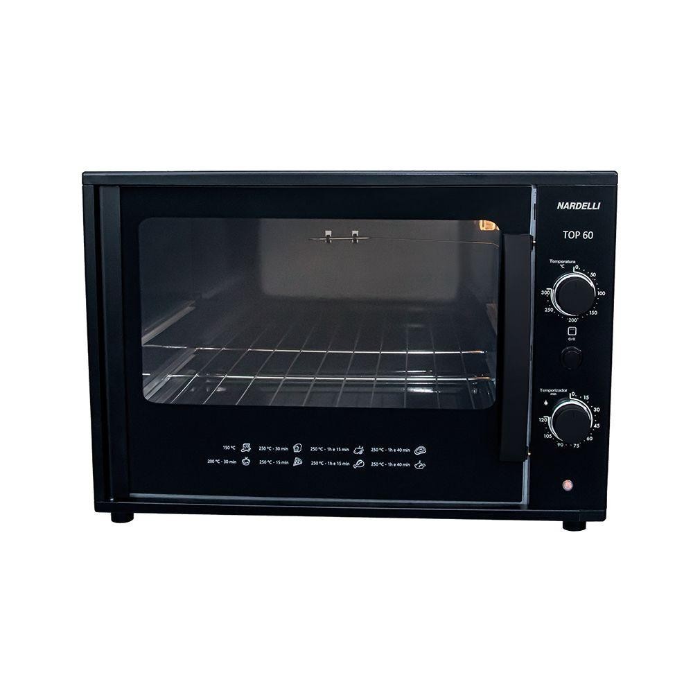 Forno Elétrico de Bancada Nardelli TOP 60 Black 60 Litros Preto 220V A procura pelo aliado perfeito a sua cozinha terminou, com a linha de fornos TOP60 da Nardelli, você terá tudo que precisa na bancada de sua cozinha. Seu design exclusivo e moderno combinará com a decoração da sua cozinha, valorizando tudo a sua volta. O forno perfeito para auxiliar nas receitas para você e toda a sua família. Com ampla capacidade, de 60 litros, pode ser utilizado em seu total potencial e traz muito mais versatilidade auxiliando no preparo de receitas. Seu controle de temperatura permite que você escolha a temperatura até 300º além de possuir dourador que deixará seus alimentos muito mais saborosos. Pensando ainda na sua comodidade, este forno conta com timer de até 120 minutos, facilitando e auxiliando você na sua rotina, tornando-se muito mais eficaz e eficiente. Conta também com bandeja para resíduos e grade removíveis para facilitar e seu interior ainda possui acabamento esmaltado Easy Clean que auxilia ainda mais na limpeza. Especificações Técnicas: - Marca: Nardelli - Modelo: TOP 60 BLACK - Voltagem: 220V - Tipo: Forno Elétrico de Bancada - Cor: Preto - Capacidade: 60 Litros - Potência: 1750 W - Consumo: 1,2 kWh - Corrente: 8 A - Frequência: 60Hz - Material do Forno (Corpo): Capa PP Preta - Material do Forno (Frontal): Capa PP Preta - Interior: Easy Clean - Abertura da Porta: Lateral - Painel: Manual - Termostato: Sim, até 300º - Grill: Sim - Timer: Sim, 120 min - Dourador: Sim - Luz Interna: Sim (Lâmpada com Protetor) - Luz Piloto: Sim - Autolimpante: Não - Pés Anti-derrapantes: Sim - Isolamento Térmico: Sim - Dimensões Externas Frontal (LxAxP): 57,53 x 41,25 x 45,13 cm - Dimensões Internas do Produto (LxAxP): 45 x 35,36 x 37,45 cm - Dimensões da Embalagem (LxAxP): 48 x 62 x 47 cm cm - Peso Líquido: 11,5 kg - Peso Bruto: 12,5 kg - Garantia: 12 Meses
