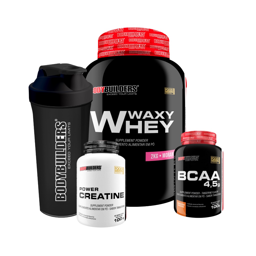 Waxy Whey O Waxy Whey Bodybuilders é um suplemento de proteínas potencializadas. Com a combinação da proteína concentrada do soro do leite (popularmente conhecido como Whey Protein), proteína isolada da soja. O suplemento Waxy Whey foi desenvolvido especialmente para as pessoas que buscam o ganho de massa muscular magra, força muscular, mais energia durante os treinos e o aumento e capacidade do corpo de reparar os músculos pós-treino. Com preparo rápido, fácil e prático, e 3 deliciosas opções de sabores: Chocolate, Baunilha e Morango, o Waxy Whey se tornará um grande aliado do seu dia a dia. Como tomar Recomendamos a ingestão de 50g (5 colheres de sopa) do Waxy Whey após o treino. Beber um shake de proteína com água gelada dentro de 30 minutos após o término do treino iniciará o processo de recuperação inundando sua corrente sanguínea com aminoácidos, que são rapidamente transportados para as células musculares, onde serão depositados como novo tecido muscular. BCAA (Brain Chain Amino Acids) O que é BCAA? O BCAA é um suplemento altamente utilizado por pessoas que buscam levar uma vida mais saudável em conciliação com uma alimentação também saudável e a prática de atividades físicas. O BCAA faz parte dos aminoácidos de cadeia ramificada contendo em sua fórmula: Leucina, Valina e Isoleucina. Essas mesmas moléculas presentes no BCAA são encontradas nas fibras musculares, porém em maior quantidade, equivalendo 35% dos principais aminoácidos presente na proteína muscular. Elementos esses que contribuem para uma recuperação rápida e eficaz dos exercícios físicos praticados e no ganho de massa muscular. Por essa razão são tão importantes para quem treina pesado. Para que serve o BCAA? O BCAA auxilia na contribuição para a recuperação do desgaste físico adquirido durante os treinos de alta intensidade e aumento da construção muscular. Dentre os seus benefícios está incluído também a diminuição do desconforto pós treino, popularmente conhecido como dores musculares de início tardio, já que tendem aparecer de 12 a 24 horas após a prática da atividade física, podendo permanecer por até 72 horas em casos mais intensos. A ingestão do BCAA acelera a recuperação deste desconforto, deixando-os mais breve e ameno. Dando mais disposição para um novo dia de treino, sem dores nem desconfortos musculares. além de serem potentes anti-catabolicos, protegendo a massa muscular e evitando que o corpo entre num estado de catabolismo, onde existe a perda de massa magra devido a intensidade do exercícios. Como tomar BCAA? Essa é a dúvida de muitas pessoas, qual o melhor período para tomar o BCAA? Antes, durante ou após os treinos? Abaixo você encontra três respostas para a sua dúvida. Quando consumido antes das atividades físicas, por ter uma rápida absorção o BCAA transforma-se em fonte de energia para treinos mais intensos, prologando o treino, evitando a fadiga. Quando consumido durante as atividades físicas as substâncias presentes no BCAA, isoleucina e valina são convertidas em glicose fornecendo mais energia e evitando fadiga durante os treinos resistidos, também evitando a perda de massa muscular durante a atividade e já iniciando o processo de recuperação da massa magra que acontecerá com mais intensidade depois do exercícios finalizados. Quando consumido no pós treino o BCAA é uma grande fonte de proteína proporcionando melhor recuperação e aumento da síntese proteica, a leucina principal aminoácidos dos 3 presentes no BCAA, ativa uma cascata de reações bioquímicas no corpo proporcionando o anabolismo muscular (ganho de massa magra). Creatina A creatina é um composto orgânico, encontrada em vertebrados, onde facilita a reciclagem do trifosfato de adenosina (ATP), a moeda energética da célula, principalmente no tecido muscular e cerebral. A reciclagem é alcançada através da conversão de adenosina difosfato (ADP) de volta em ATP através da doação de grupos fosfato. A creatina também atua como um buffer armazenando energia na célula para contração muscular. Para que serve? A creatina é mais indicada para quem busca a hipertrofia e aumento da força. Além de acelerar a recuperação no pós-treino, ela aumenta a resistência dos músculos ao esforço, acumula água entre as fibras musculares, e com isso os músculos ganham volume sem que o corpo fique inchado. Como tomar creatina? A quantidade recomendada pode variar conforme o estado de saúde de cada indivíduo. Geralmente a orientação de consumo fica em aproximadamente 3 gramas ao dia. Pode ser ingerida antes ou depois do treino. A creatina é melhor absorvida após o treino junto a uma fonte de carboidrato.